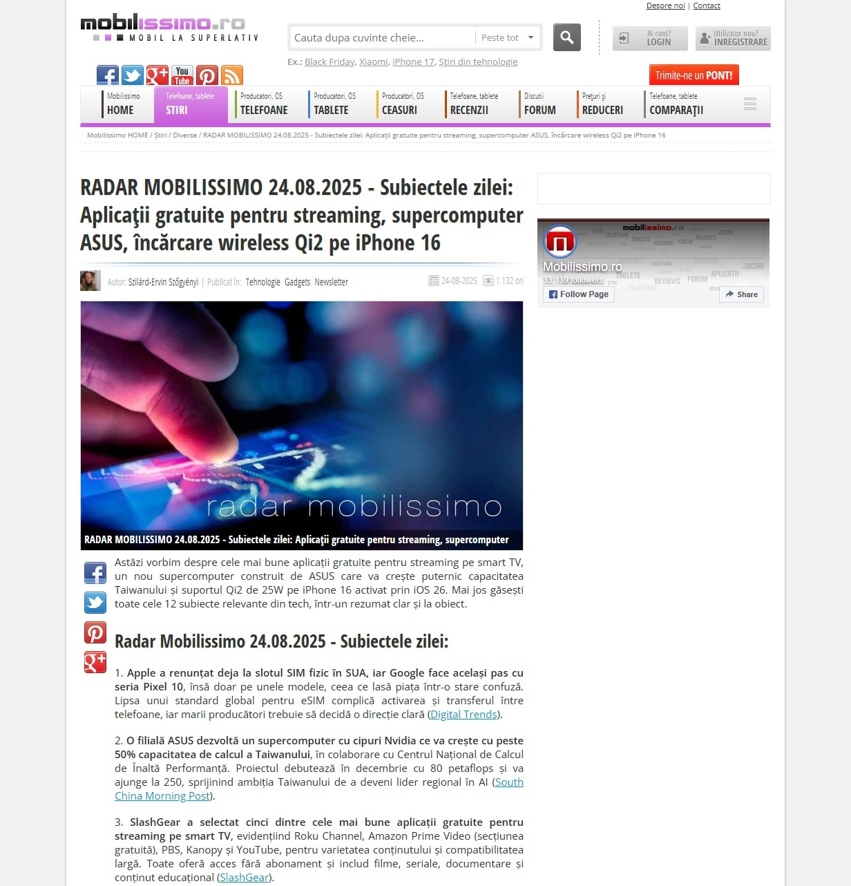 RADAR MOBILISSIMO 24.08.2025 - Subiectele zilei: Aplicații gratuite pentru streaming, supercomputer ASUS, incarcare wireless Qi2 pe iPhone 16