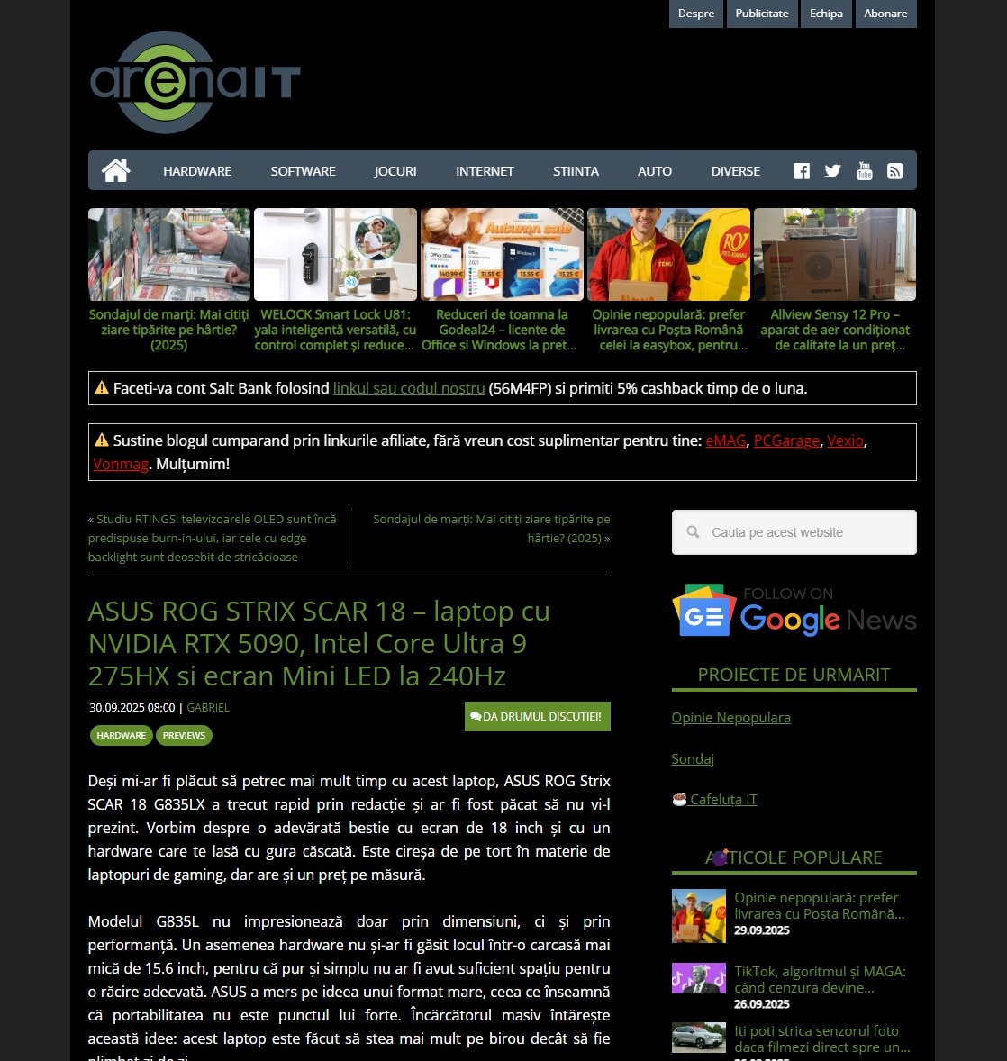 ASUS ROG STRIX SCAR 18 – laptop cu NVIDIA RTX 5090, Intel Core Ultra 9 275HX si ecran Mini LED la 240Hz