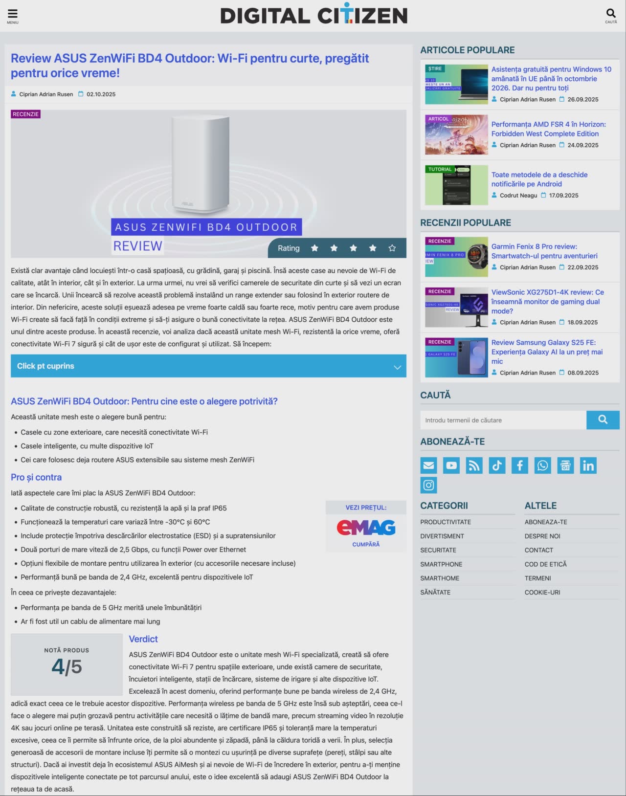 Review ASUS ZenWiFi BD4 Outdoor: Wi-Fi pentru curte, pregatit pentru orice vreme!