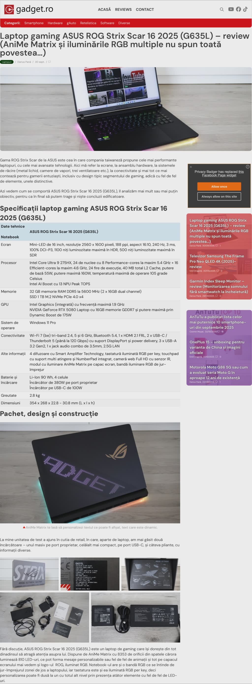 Laptop gaming ASUS ROG Strix Scar 16 2025 (G635L) – review (AniMe Matrix și iluminarile RGB multiple nu spun toata povestea…)