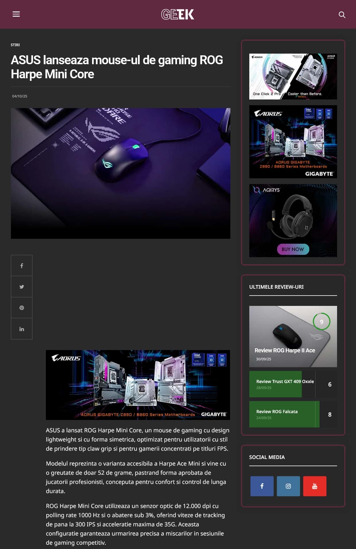 ASUS introduces the ROG Harpe Mini Core, a lightweight wired gaming mouse with 8000 Hz polling rate, ergonomic design, and precise sensor, aimed at competitive gamers seeking speed and control.
