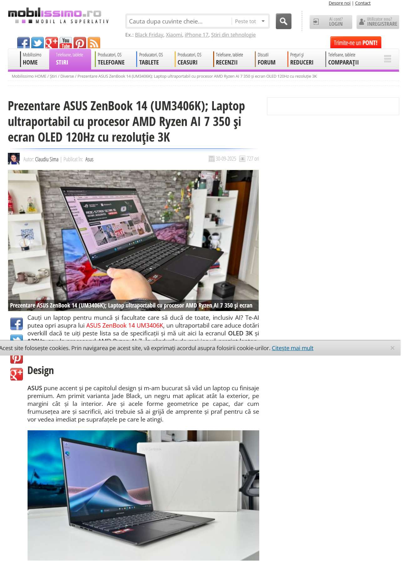 Prezentare ASUS ZenBook 14 (UM3406K); Laptop ultraportabil cu procesor AMD Ryzen AI 7 350 și ecran OLED 120Hz cu rezoluție 3K
