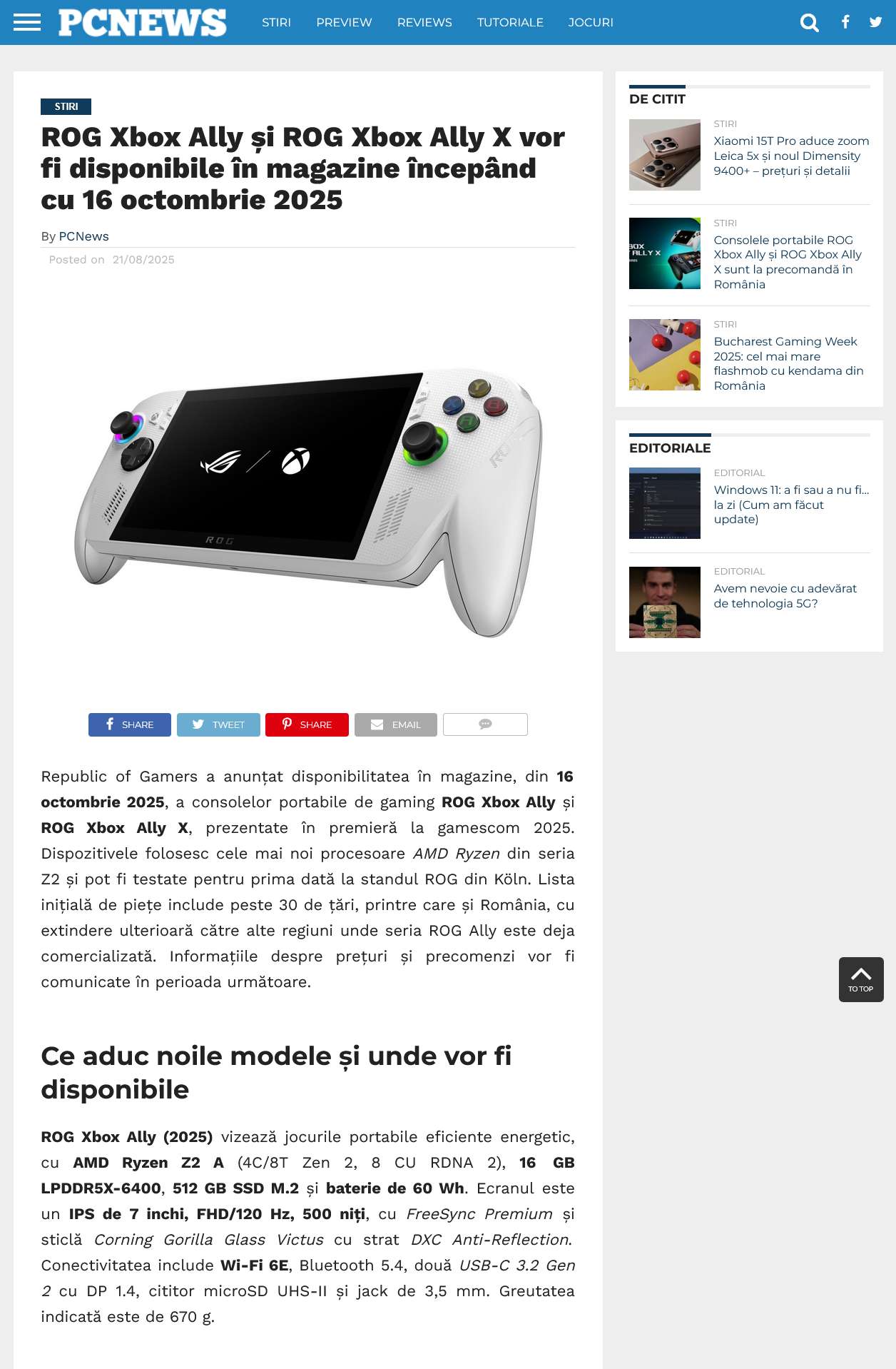 ASUS and Microsoft officially announced that the ROG Xbox Ally and Ally X portable gaming consoles will be available in stores starting October 16, 2025, including in Romania. These devices feature AMD Ryzen Z2 processors and a full-screen Xbox interface, offering an enhanced gaming experience. They are designed to support a wide range of PC games, with optimizations for portable play. The consoles are available for pre-order through official channels and local retailers.