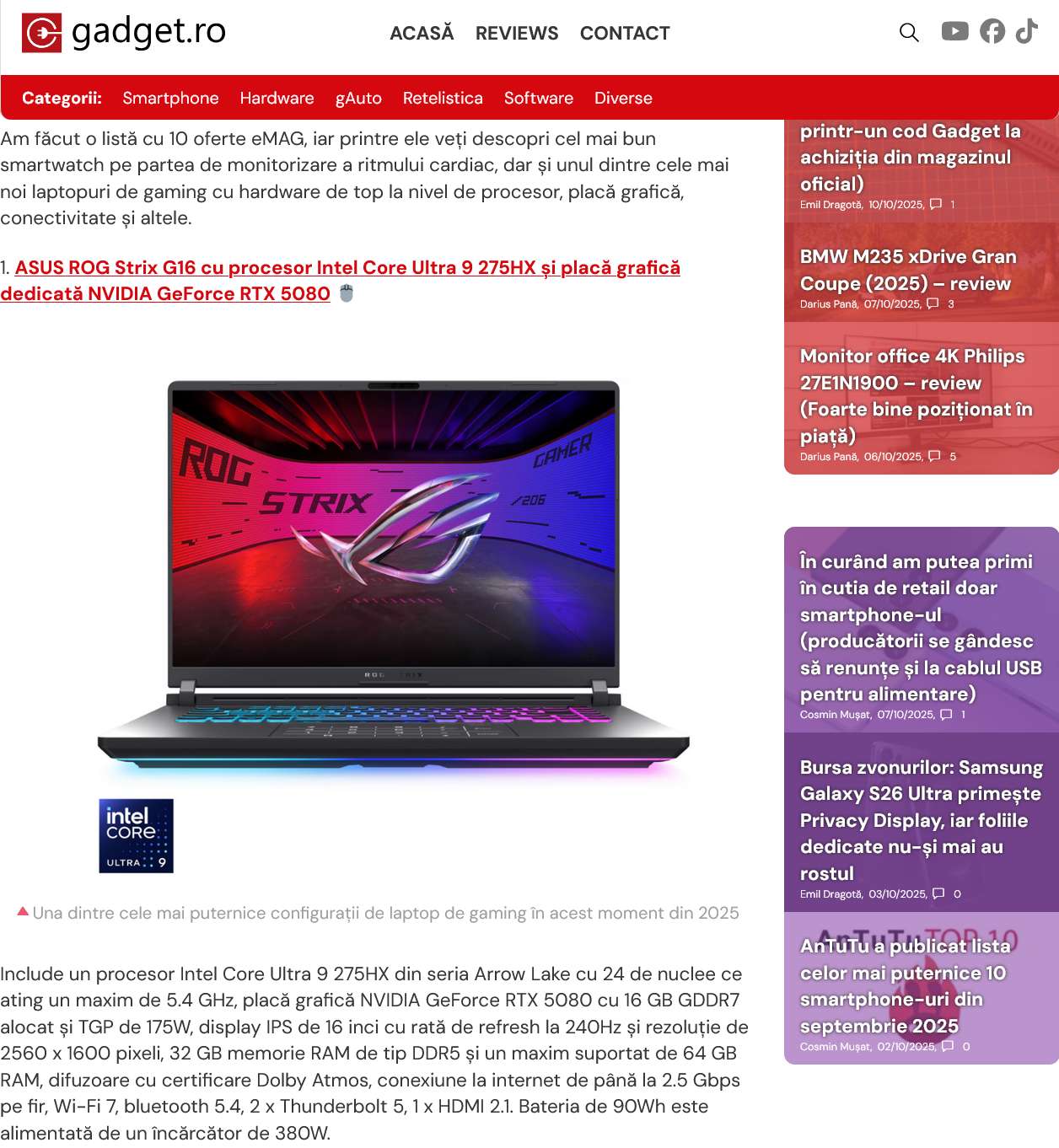 The Gadget.ro article lists the top 10 eMAG deals from April 5, 2025, featuring an ASUS ROG Strix G16 laptop with Intel Core Ultra 9 275HX and NVIDIA GeForce RTX 5080.