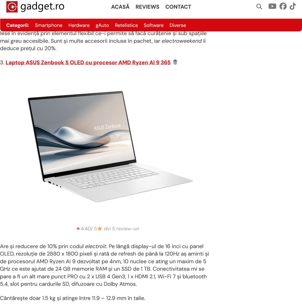 The Gadget.ro article highlights top eMAG deals, including an ASUS Zenbook S OLED laptop with AMD Ryzen AI 9 365 processor.