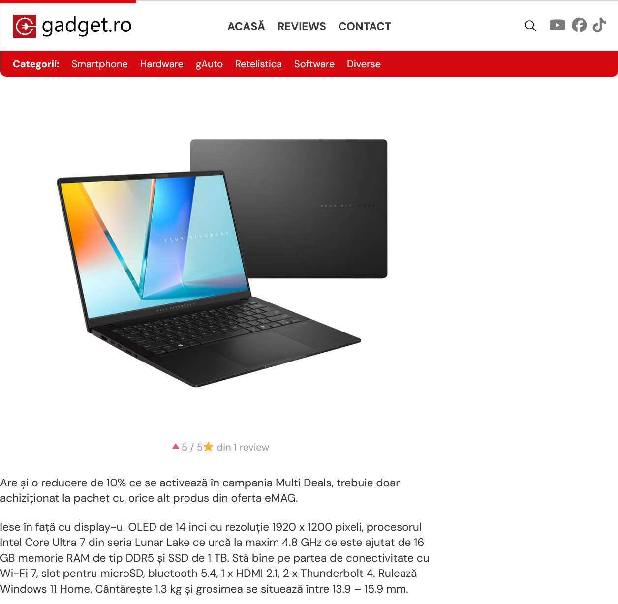 The Gadget.ro article highlights top eMAG deals including an ASUS Vivobook S 14 S5406SA laptop
