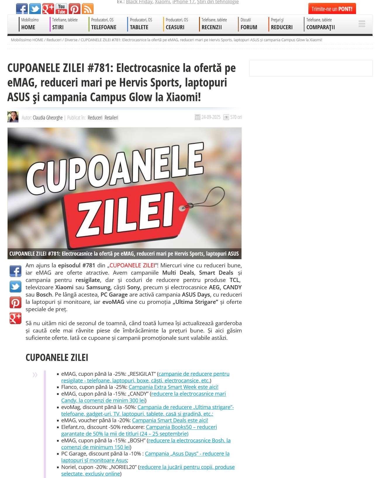 CUPOANELE ZILEI #781: Electrocasnice la oferta pe eMAG, reduceri mari pe Hervis Sports, laptopuri ASUS și campania Campus Glow la Xiaomi!