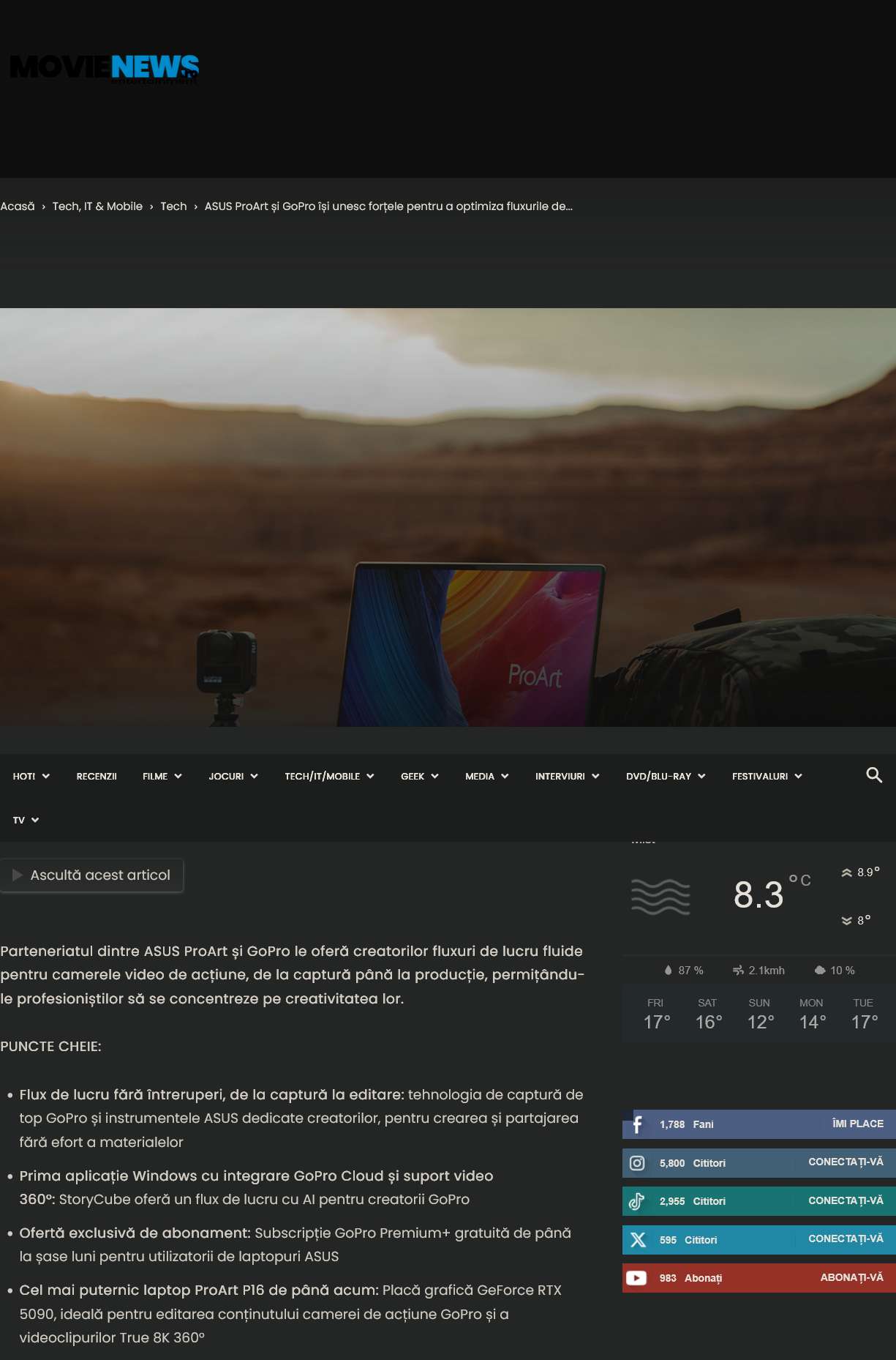 ASUS ProArt și GoPro iși unesc forțele pentru a optimiza fluxurile de lucru ale creatorilor cu ajutorul AI