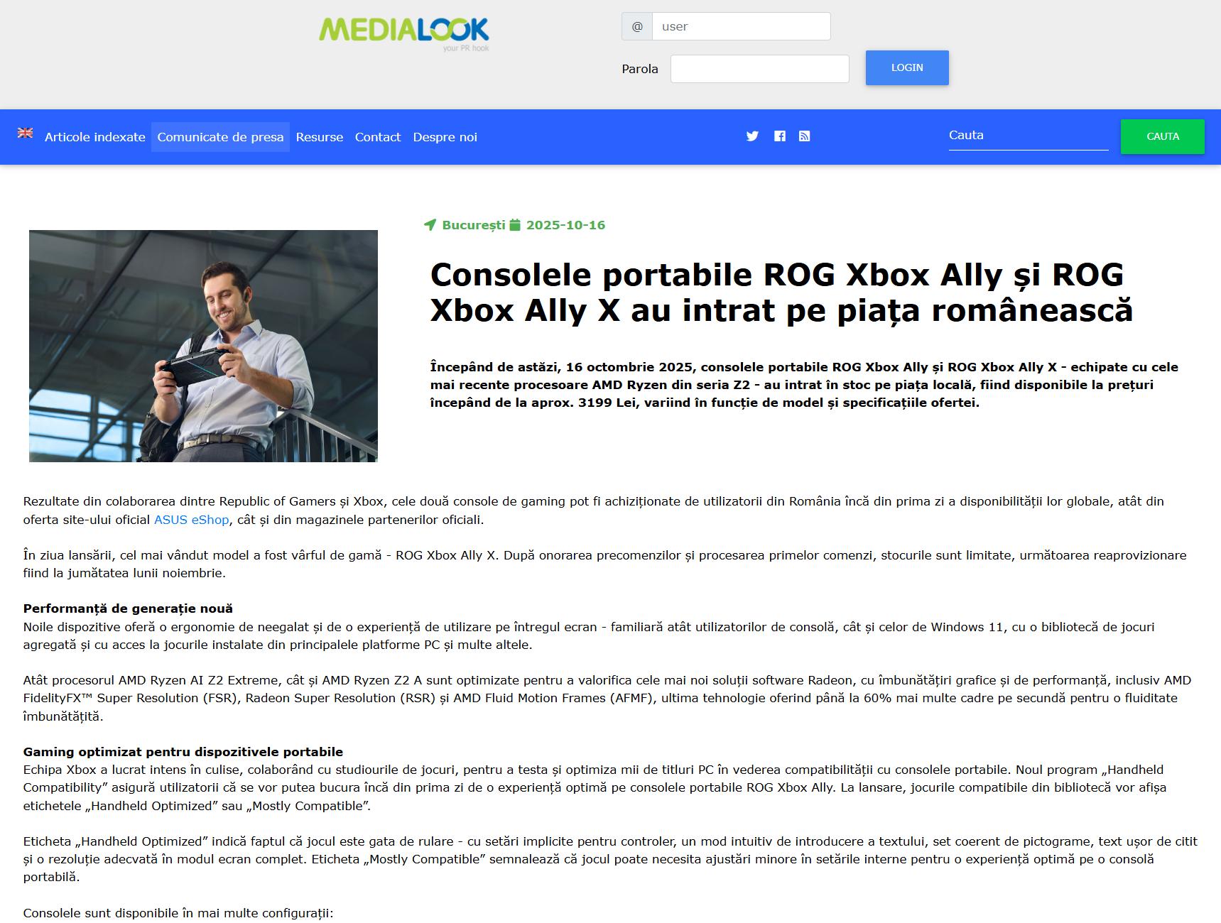 Starting today, October 16, 2025, the ROG Xbox Ally and ROG Xbox Ally X portable consoles - equipped with the latest AMD Ryzen Z2 series processors - have entered stock on the local market, being available at prices starting from approximately 3199 Lei, varying depending on the model and the specifications of the offer.