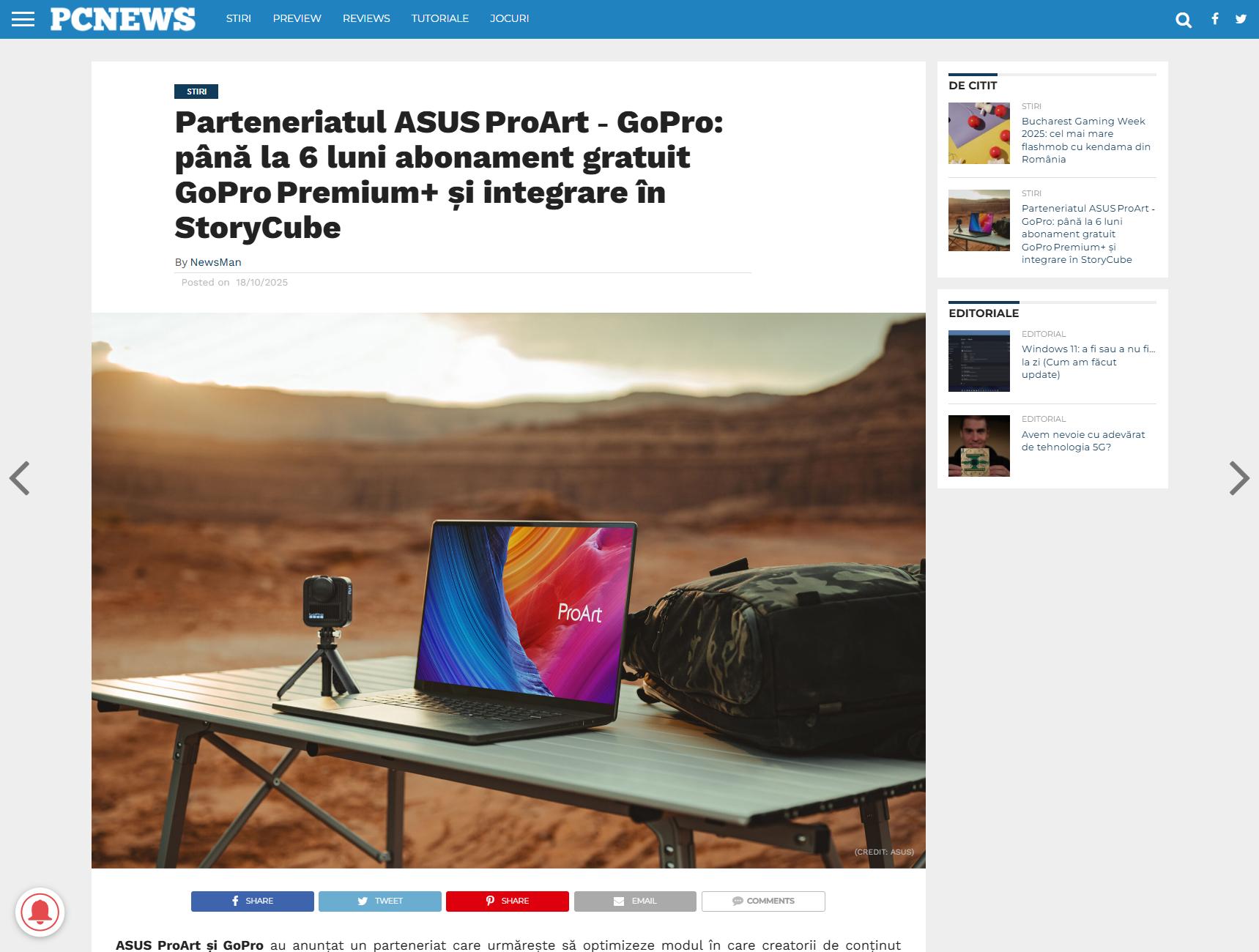Parteneriatul ASUS ProArt ‑ GoPro: pana la 6 luni abonament gratuit GoPro Premium+ și integrare in StoryCube