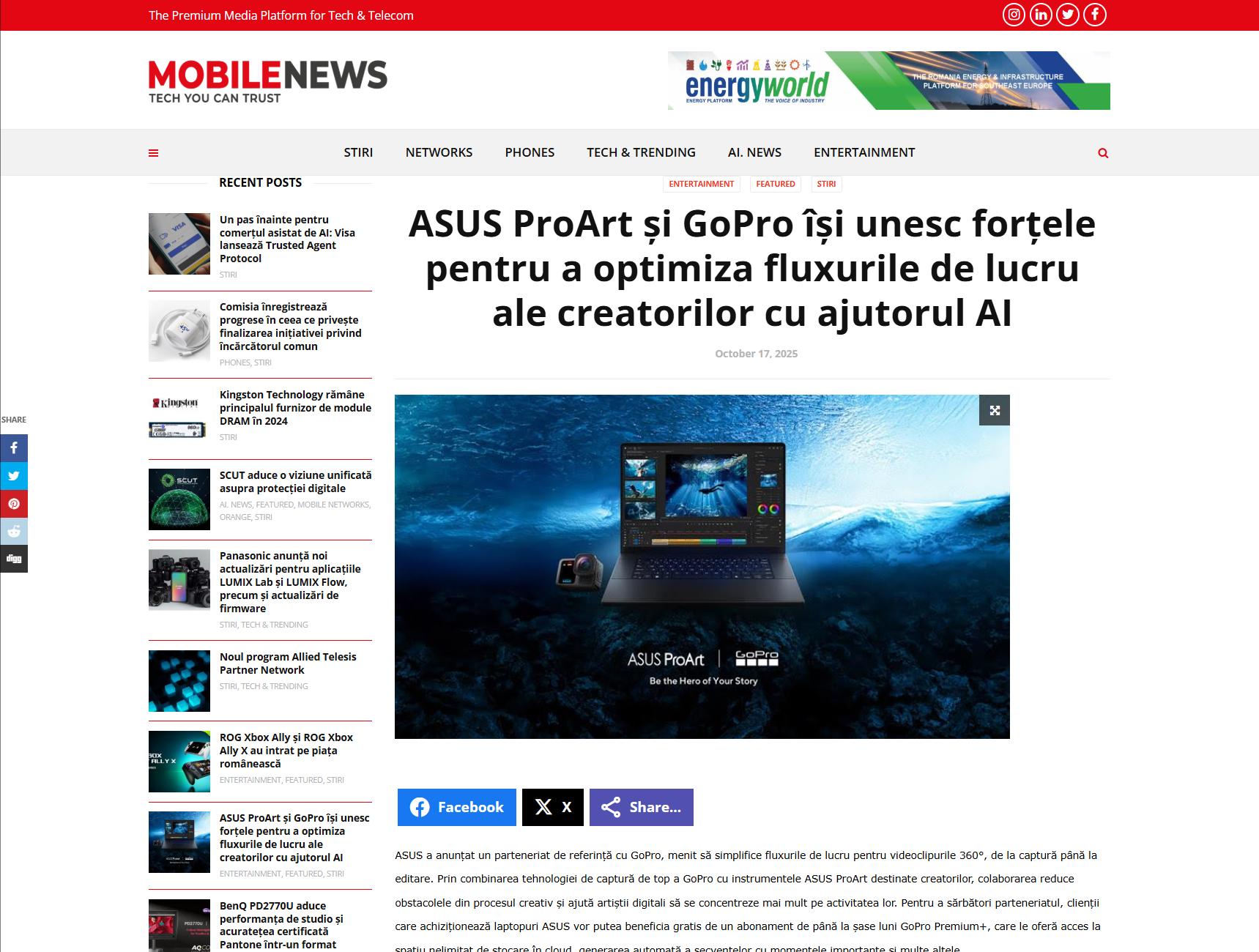 ASUS ProArt și GoPro iși unesc forțele pentru a optimiza fluxurile de lucru ale creatorilor cu ajutorul AI