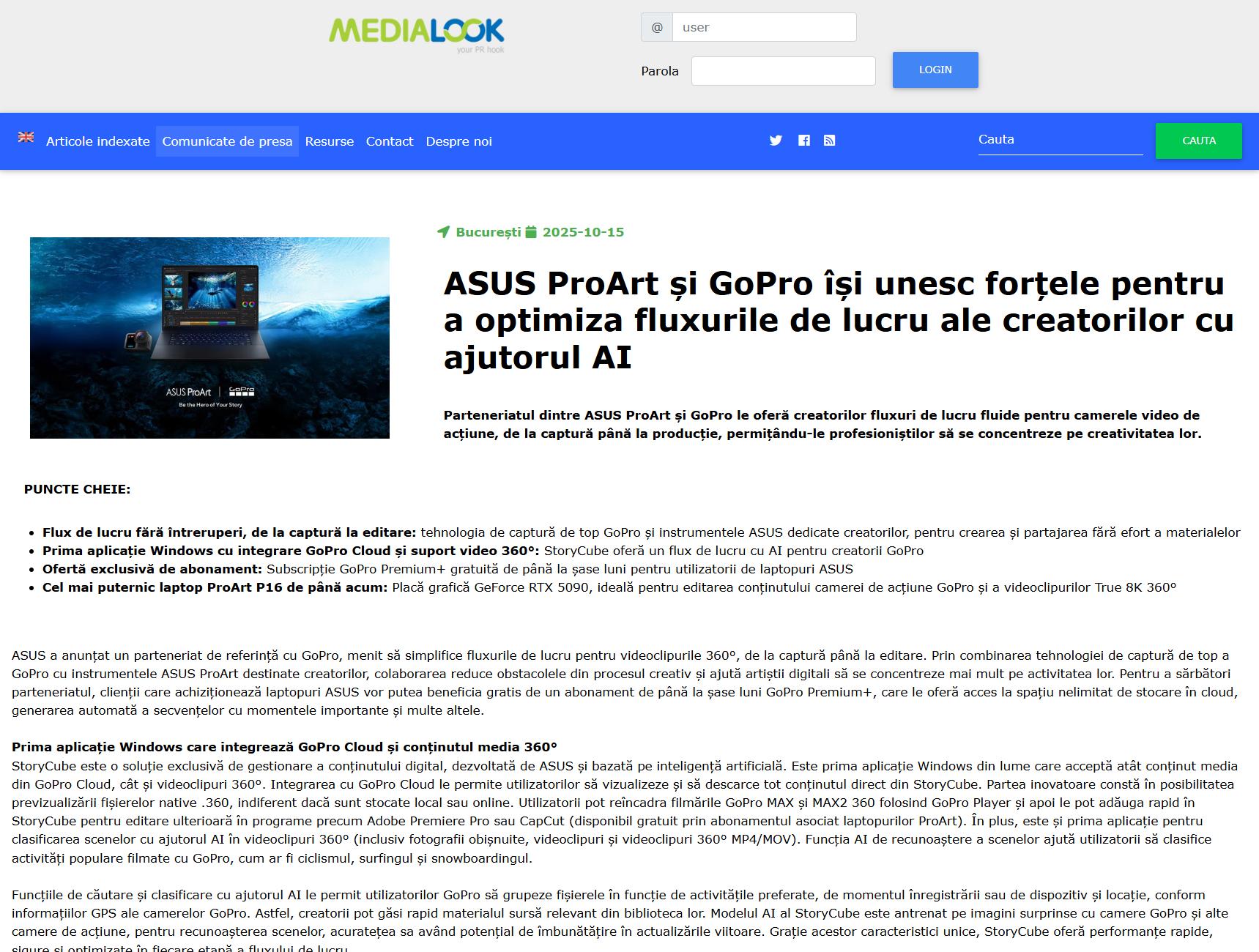 ASUS ProArt și GoPro iși unesc forțele pentru a optimiza fluxurile de lucru ale creatorilor cu ajutorul AI