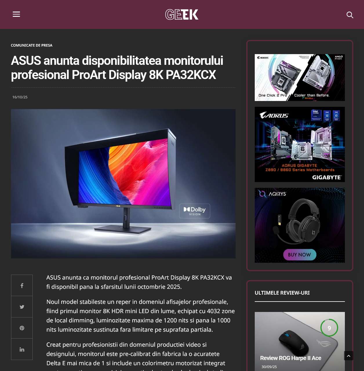 ASUS anunta disponibilitatea monitorului profesional ProArt Display 8K PA32KCX