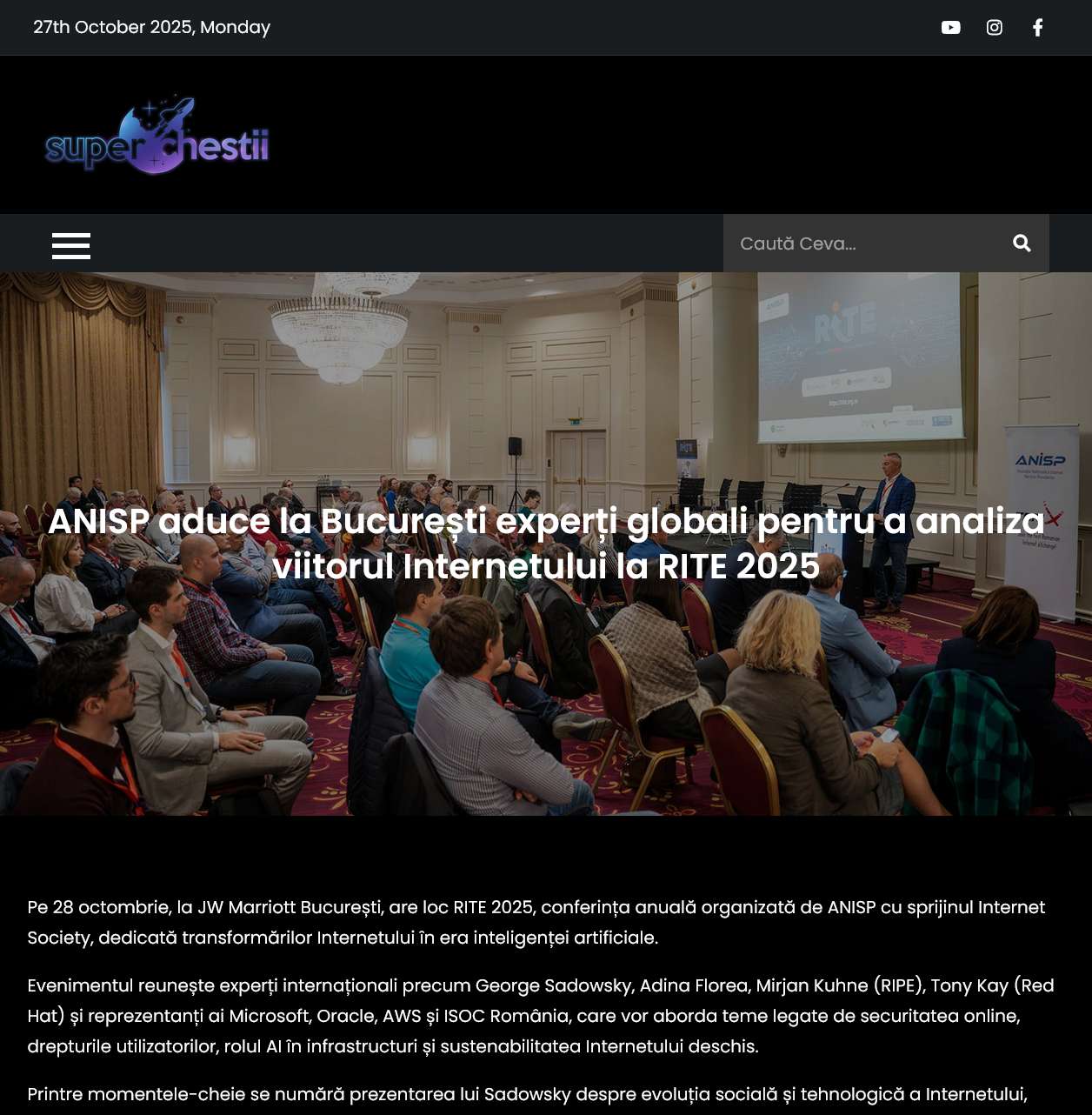 On October 28, JW Marriott Bucharest will host RITE 2025, the annual conference organized by ANISP with the support of the Internet Society, dedicated to the transformations of the Internet in the era of artificial intelligence.