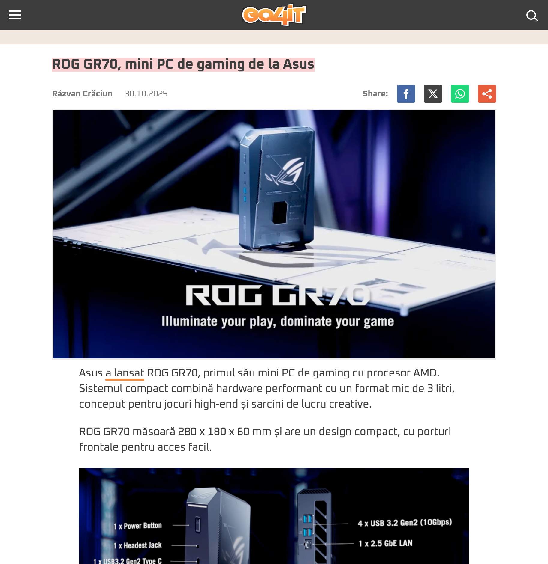 Asus has launched the ROG GR70, its first mini gaming PC with an AMD processor. The compact system combines powerful hardware with a small 3-liter form factor, designed for high-end gaming and creative workloads.