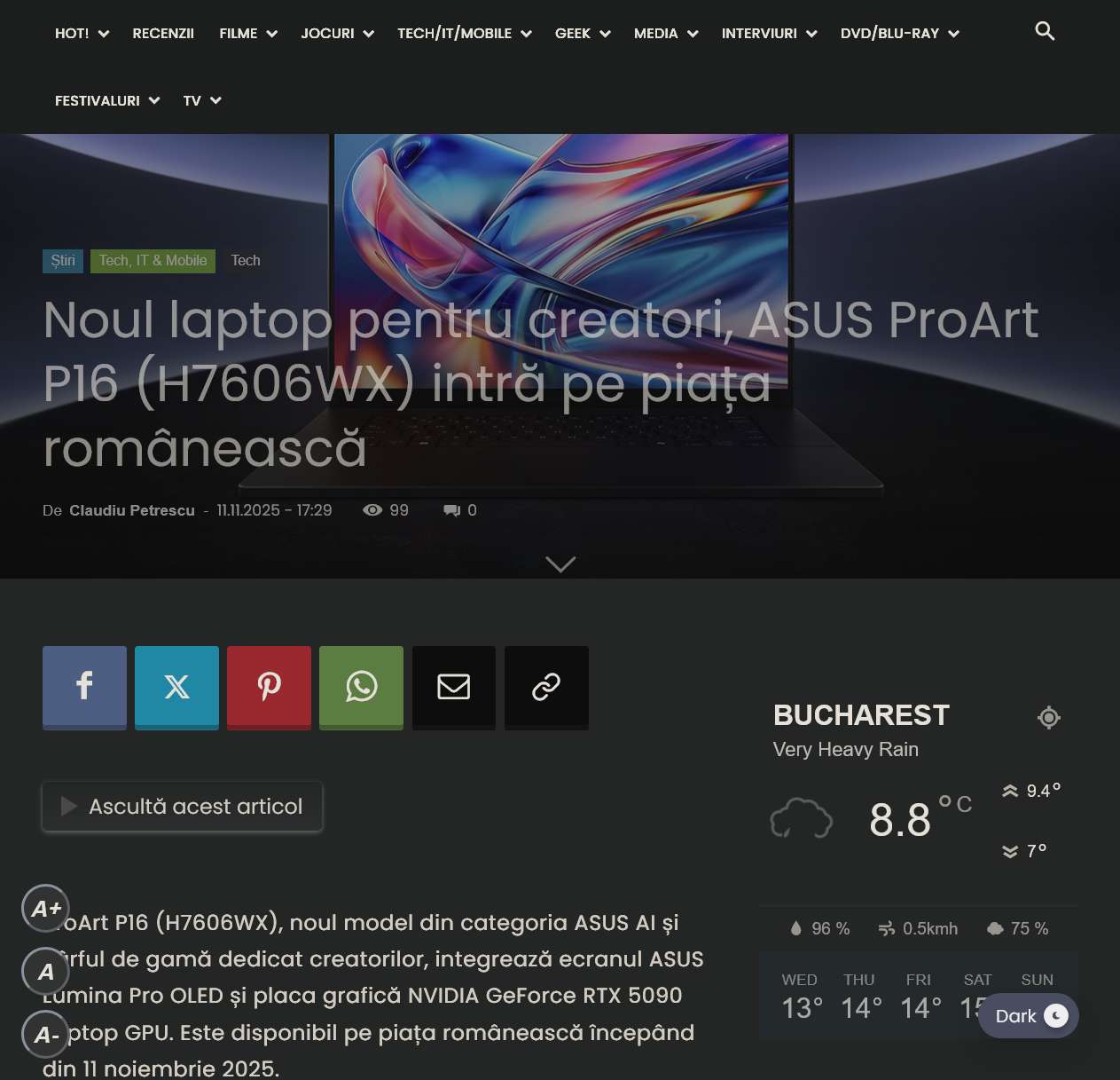 Noul laptop pentru creatori, ASUS ProArt P16 (H7606WX) intra pe piața romaneasca
