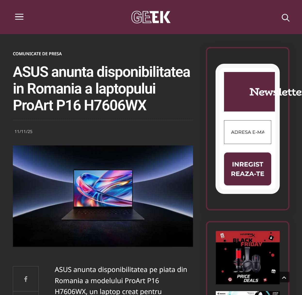 ASUS anunta disponibilitatea in Romania a laptopului ProArt P16 H7606WX