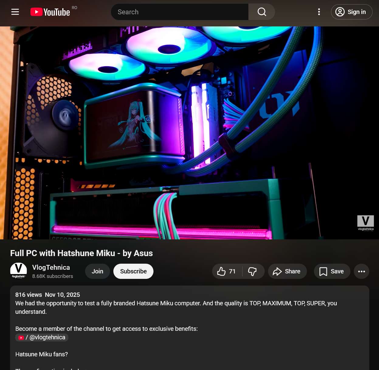 High-end custom Asus ROG PC themed after Hatsune Miku, with Ryzen 7 9800X3D, RTX 5080, Kingston Fury SSD/RAM, top cooling, RGB, and themed peripherals. Excellent performance, cool temps, full customization, premium build quality.