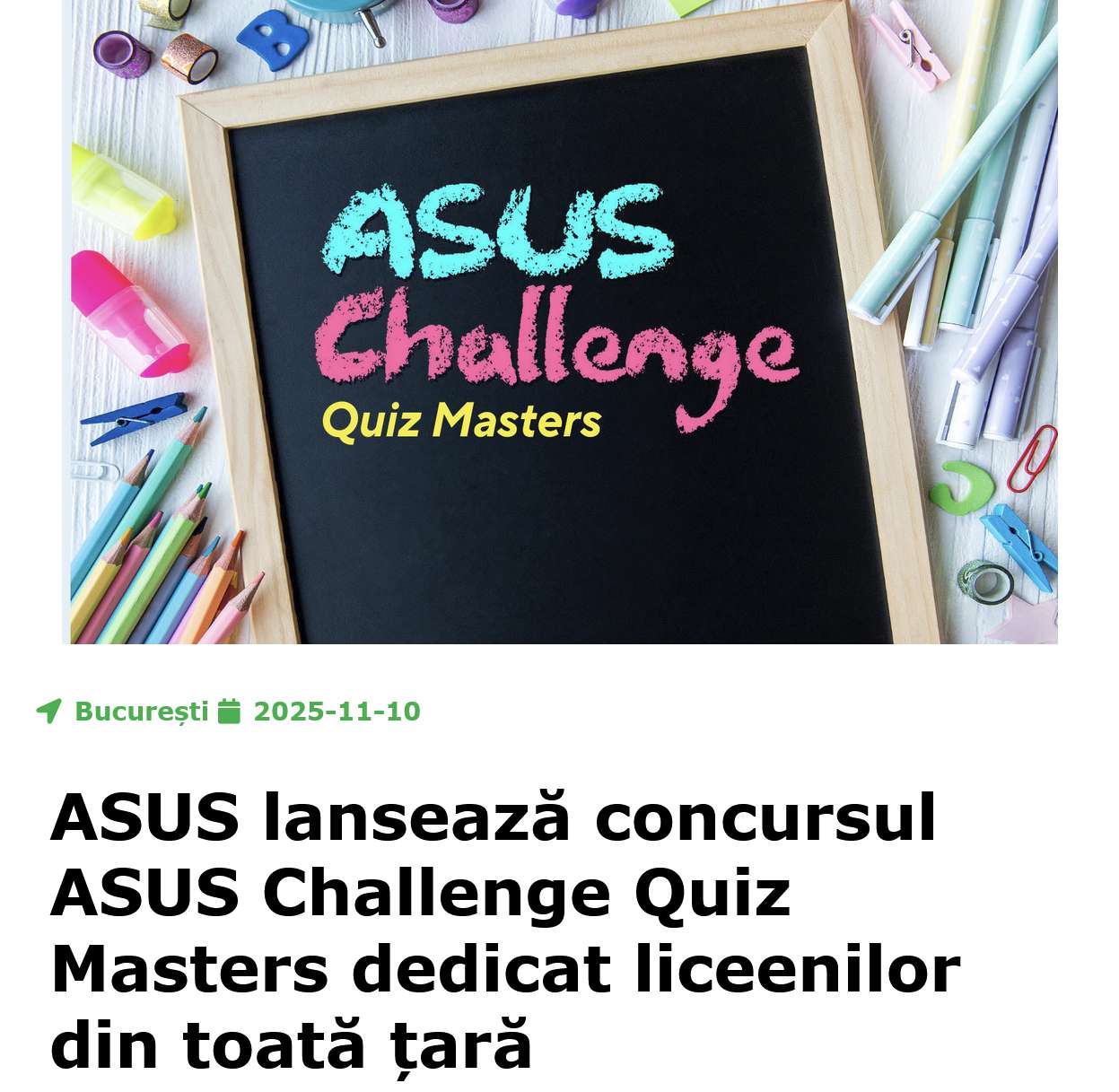 ASUS invites high school students from across the country, aged 16 and above, to participate in the ASUS Challenge Quiz Masters online competition, held on the Kahoot! platform, with prizes totaling 20,000 lei.
