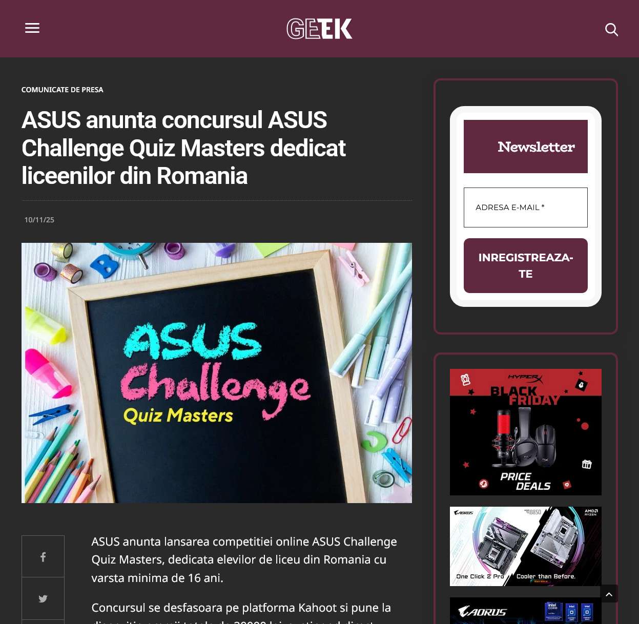 ASUS invites high school students from across the country, aged 16 and above, to participate in the ASUS Challenge Quiz Masters online competition, held on the Kahoot! platform, with prizes totaling 20,000 lei.