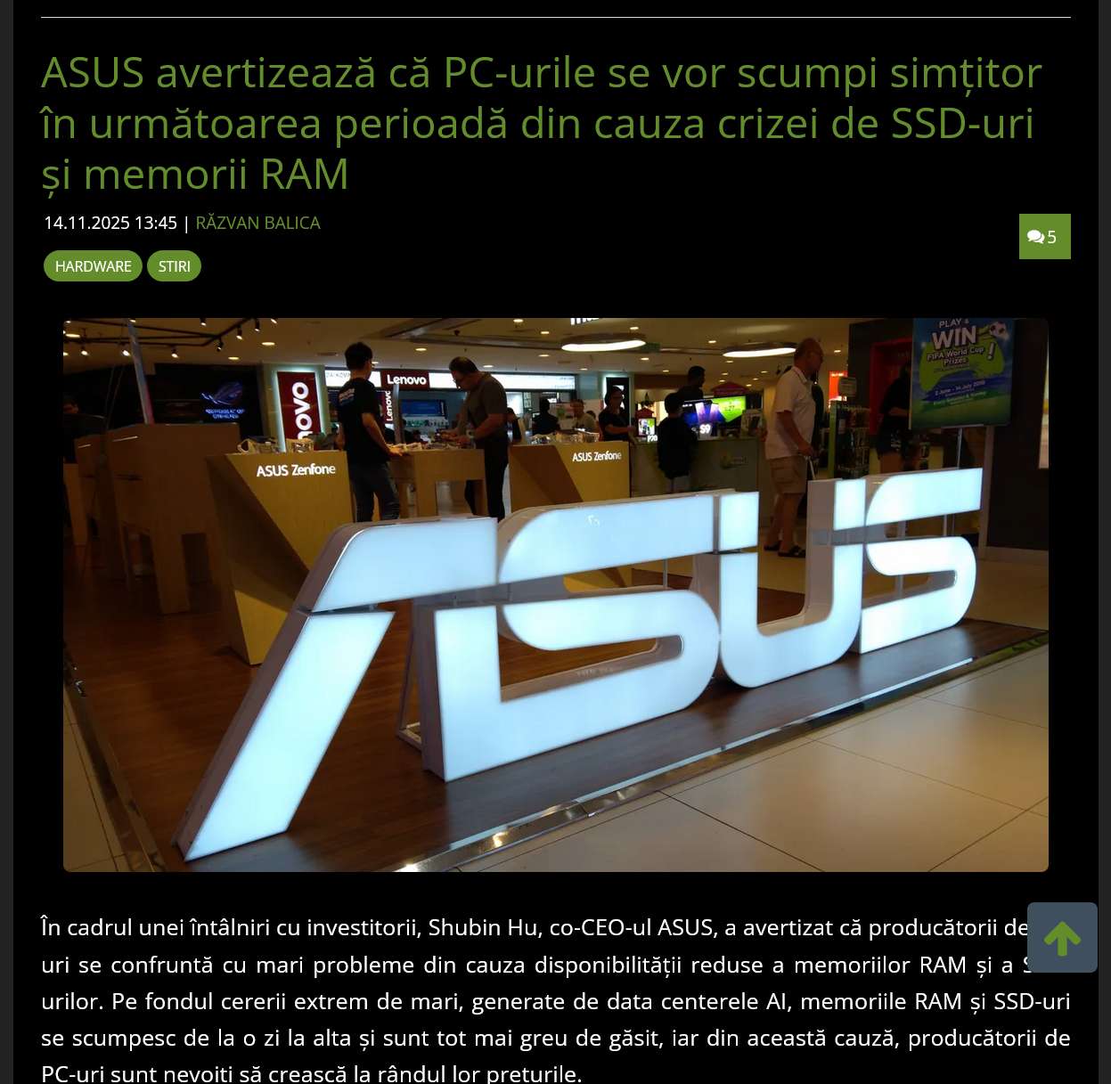 ASUS avertizeaza ca PC-urile se vor scumpi simțitor in urmatoarea perioada din cauza crizei de SSD-uri și memorii RAM