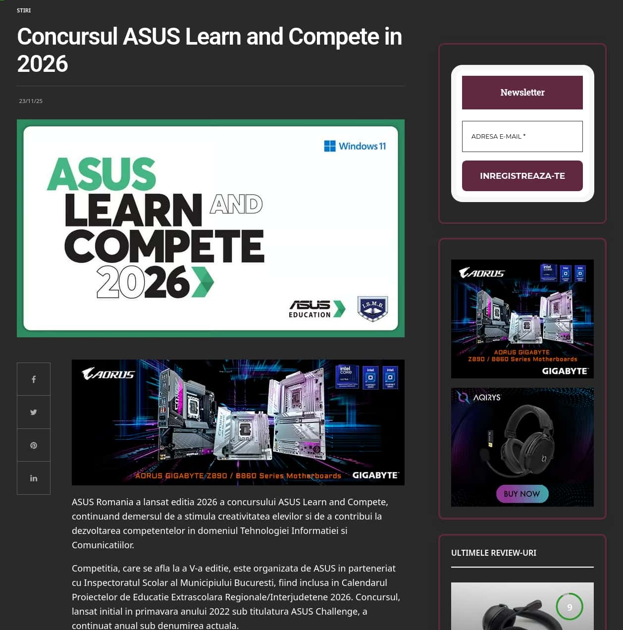 ASUS Romania has launched the 2026 edition of the ASUS Learn and Compete competition, continuing its efforts to stimulate students' creativity and contribute to the development of skills in the field of Information and Communication Technology.