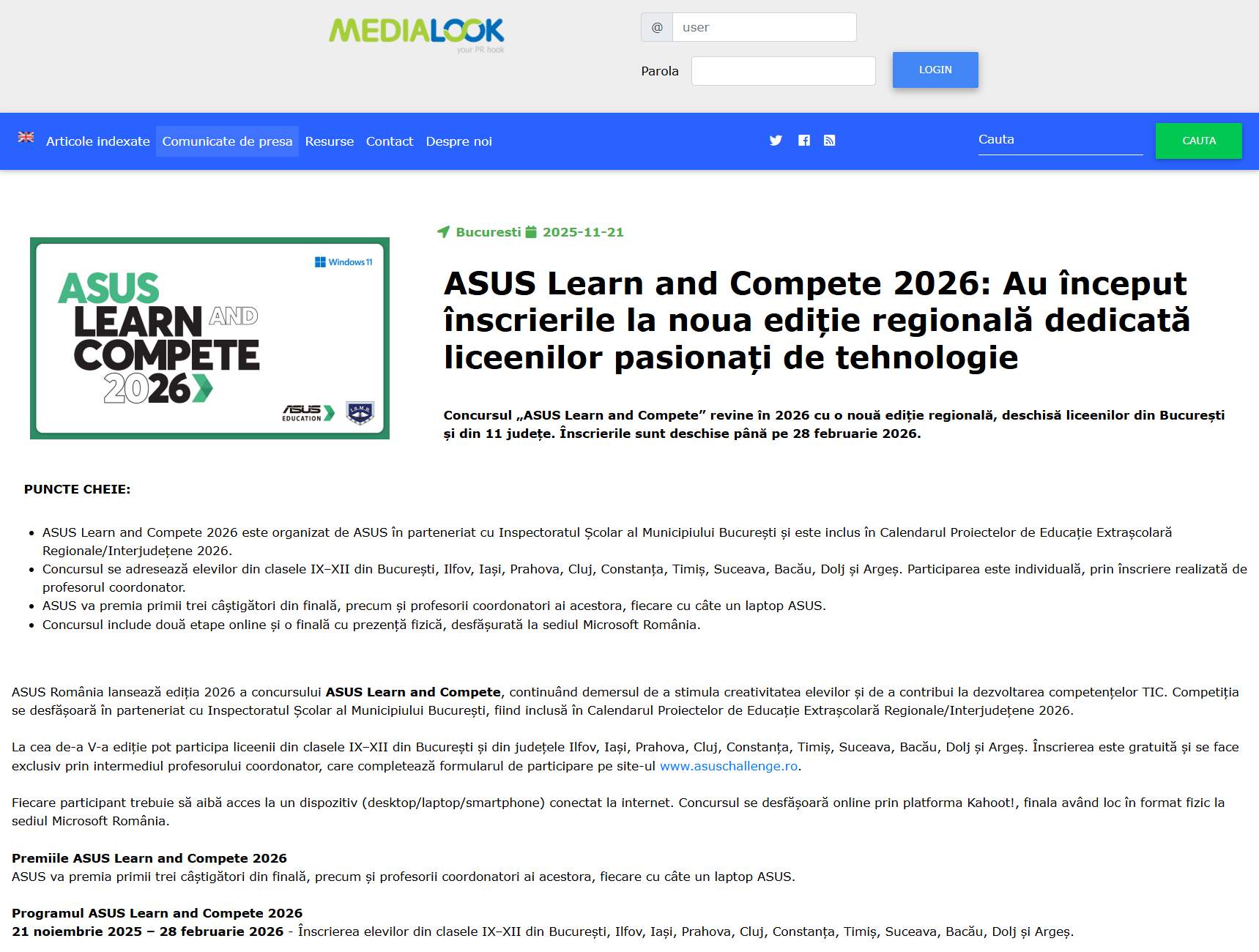 ASUS Romania has launched the 2026 edition of the ASUS Learn and Compete competition, continuing its efforts to stimulate students' creativity and contribute to the development of skills in the field of Information and Communication Technology.