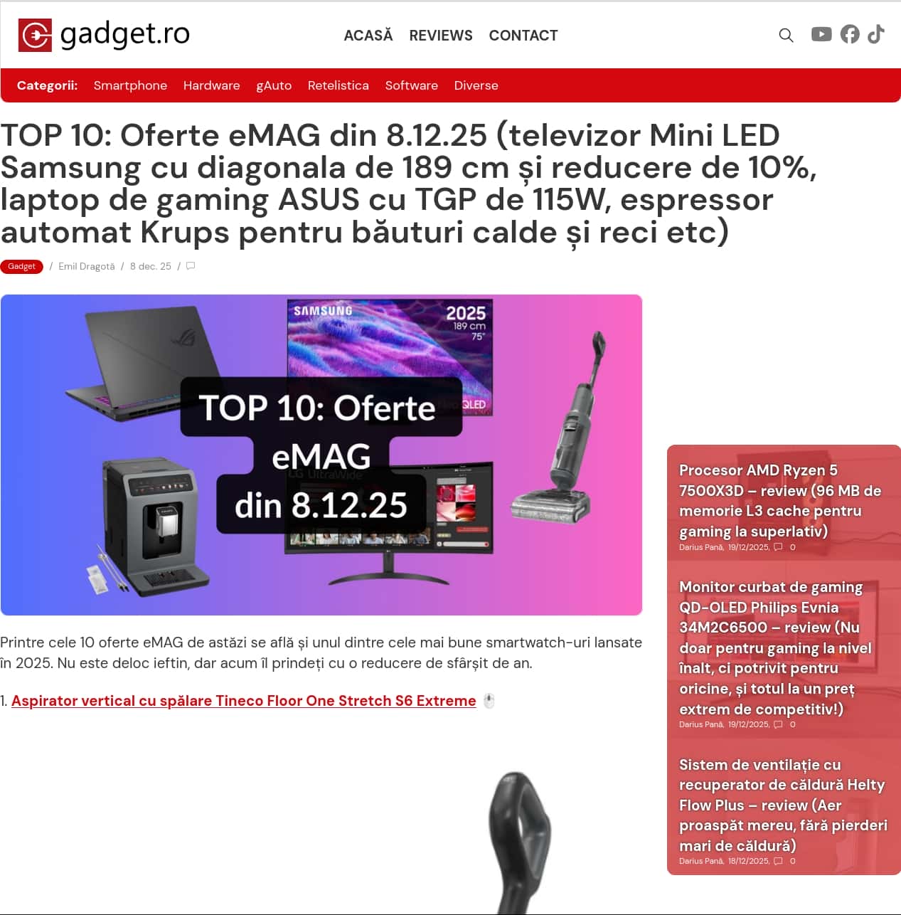 TOP 10: Oferte eMAG din 8.12.25 (televizor Mini LED Samsung cu diagonala de 189 cm și reducere de 10%, laptop de gaming ASUS cu TGP de 115W, espressor automat Krups pentru bauturi calde și reci etc)
