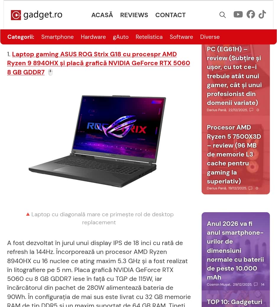 TOP 10: Oferte eMAG din 19.12.25 (televizor QD-MiniLED pe diagonala de 214 cm și cu nota 4.51 / 5 din 75 de review-uri, laptop de gaming ASUS cu display mare de 18 inci, monitor LG cu rezoluție 4K și rata de refresh la 144Hz etc)