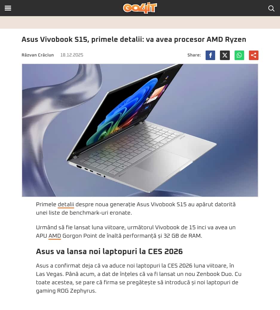 Asus Vivobook S15, primele detalii: va avea procesor AMD Ryzen
