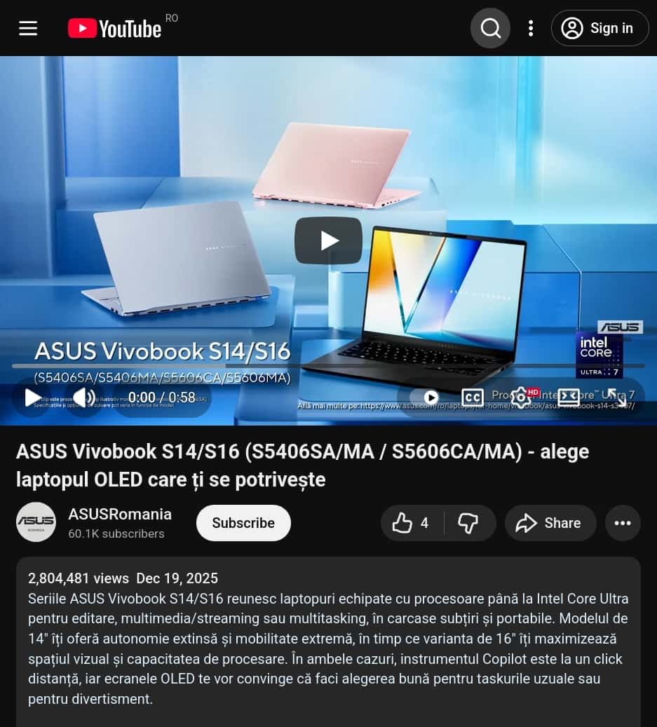 ASUS Vivobook S14/S16 (S5406SA/MA / S5606CA/MA) - alege laptopul OLED care ți se potrivește