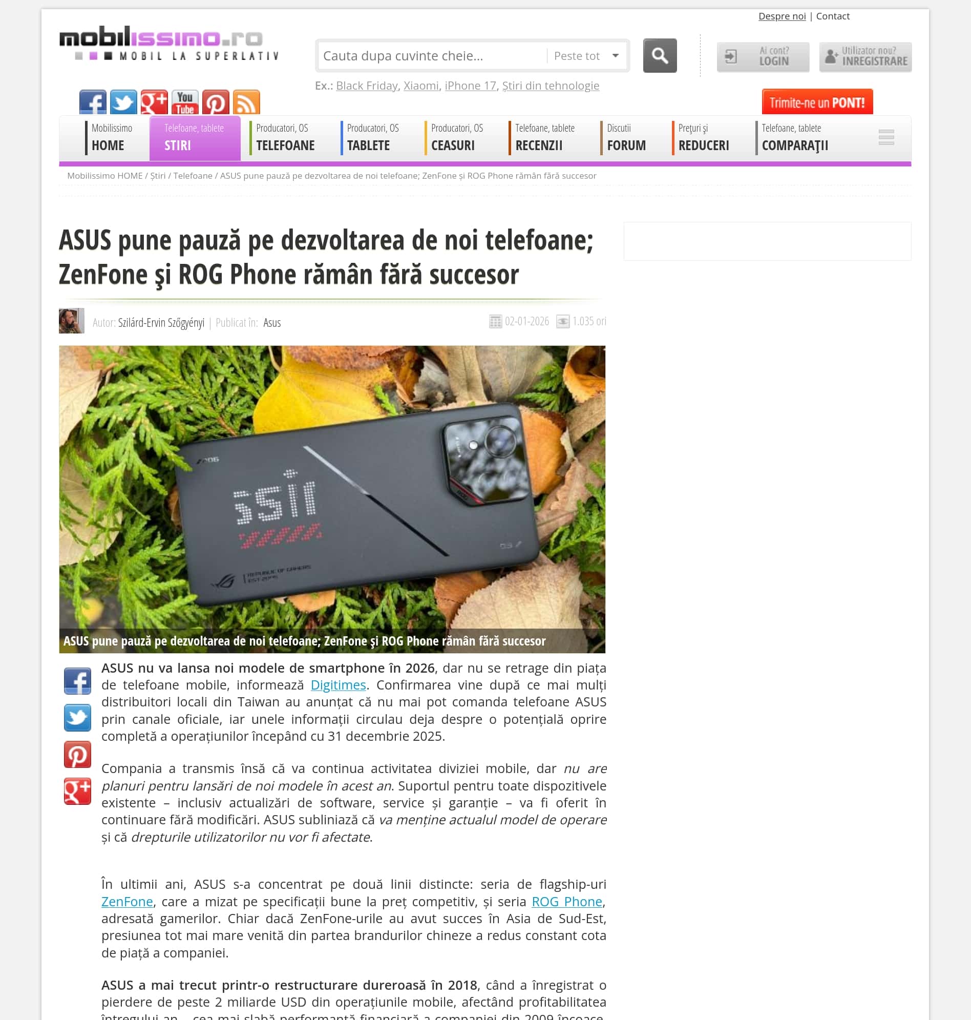 ASUS pune pauza pe dezvoltarea de noi telefoane; ZenFone și ROG Phone raman fara succesor