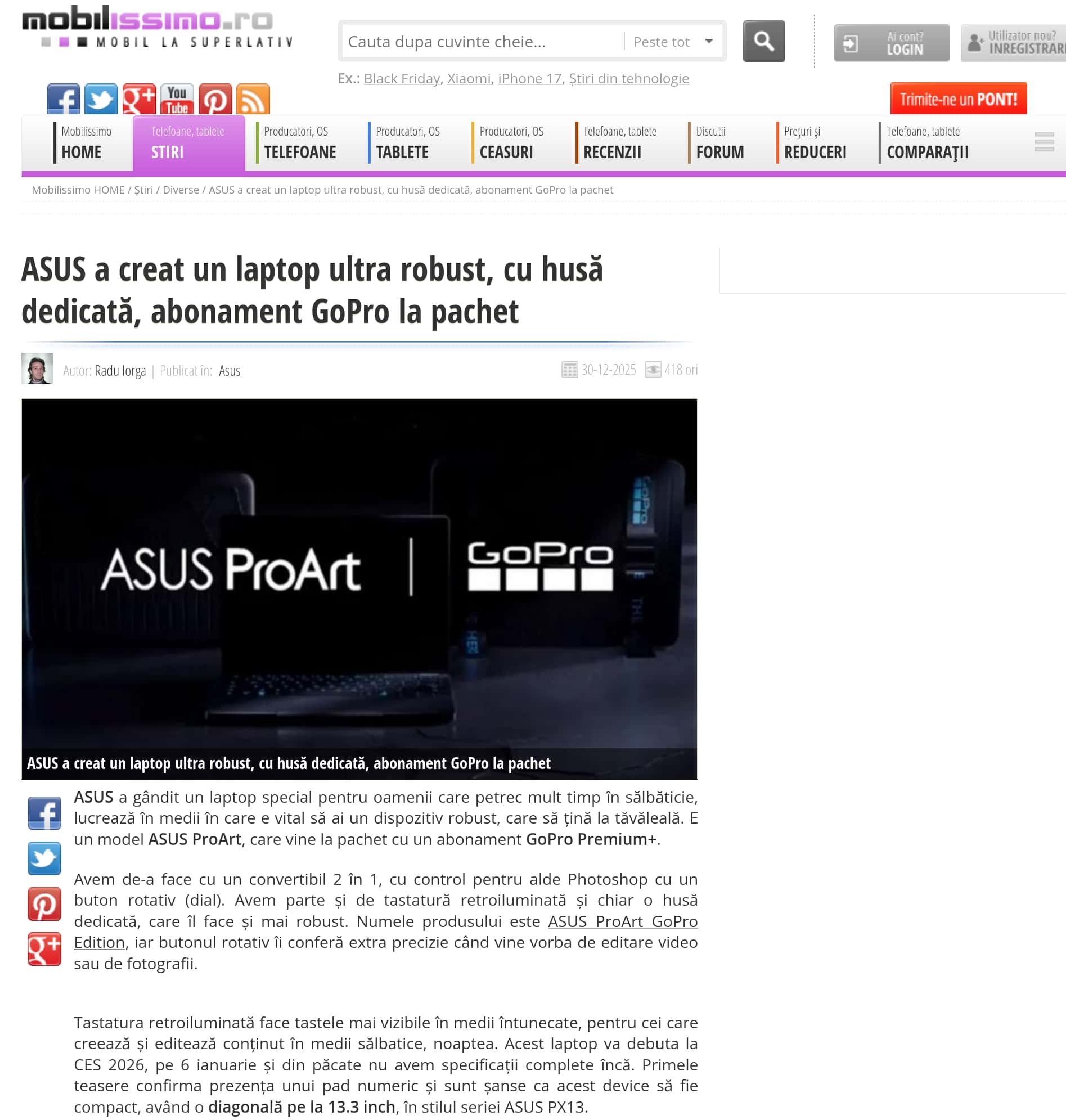 ASUS a creat un laptop ultra robust, cu husa dedicata, abonament GoPro la pachet