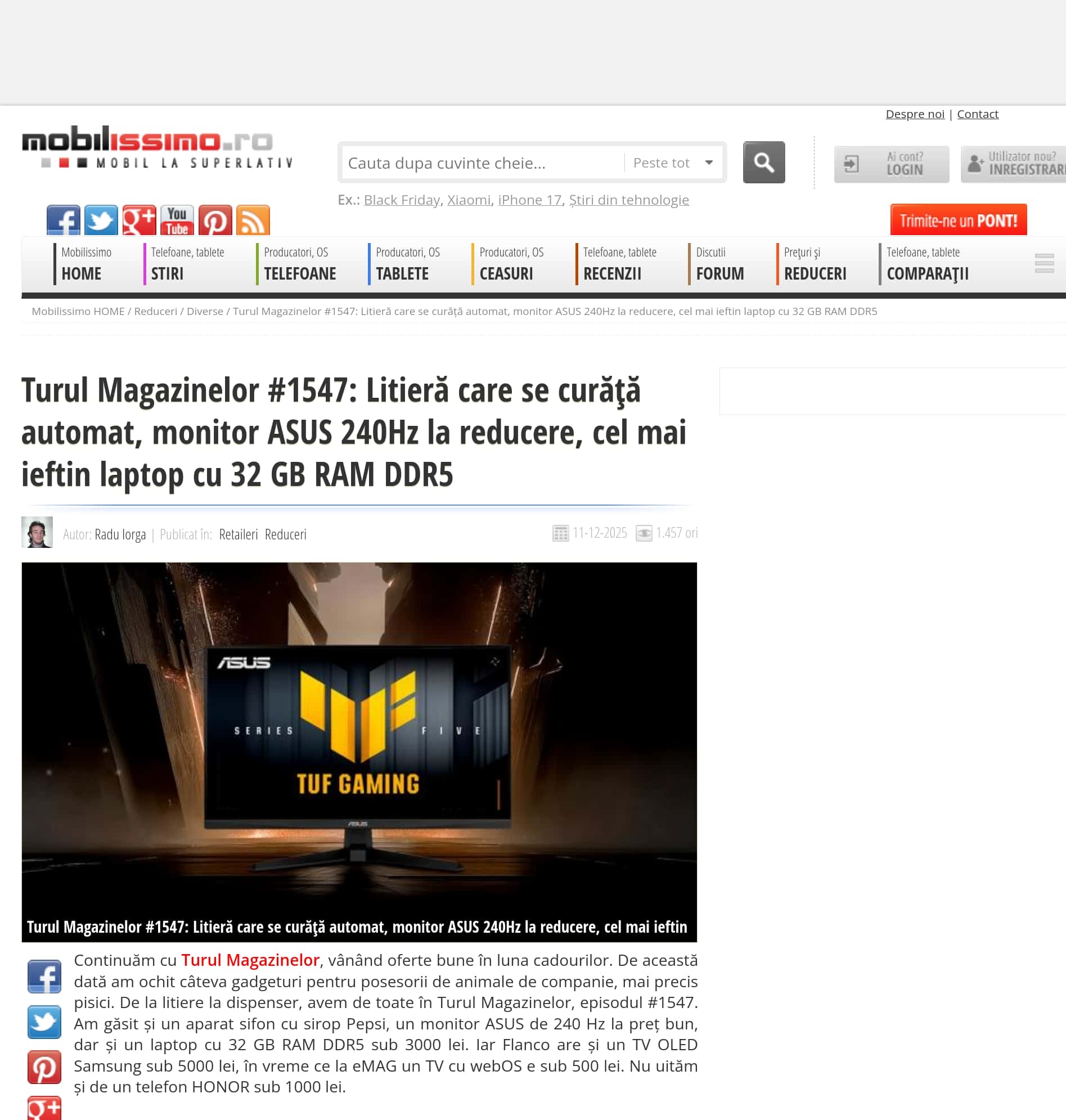 Turul Magazinelor #1547: Litiera care se curața automat, monitor ASUS 240Hz la reducere, cel mai ieftin laptop cu 32 GB RAM DDR5