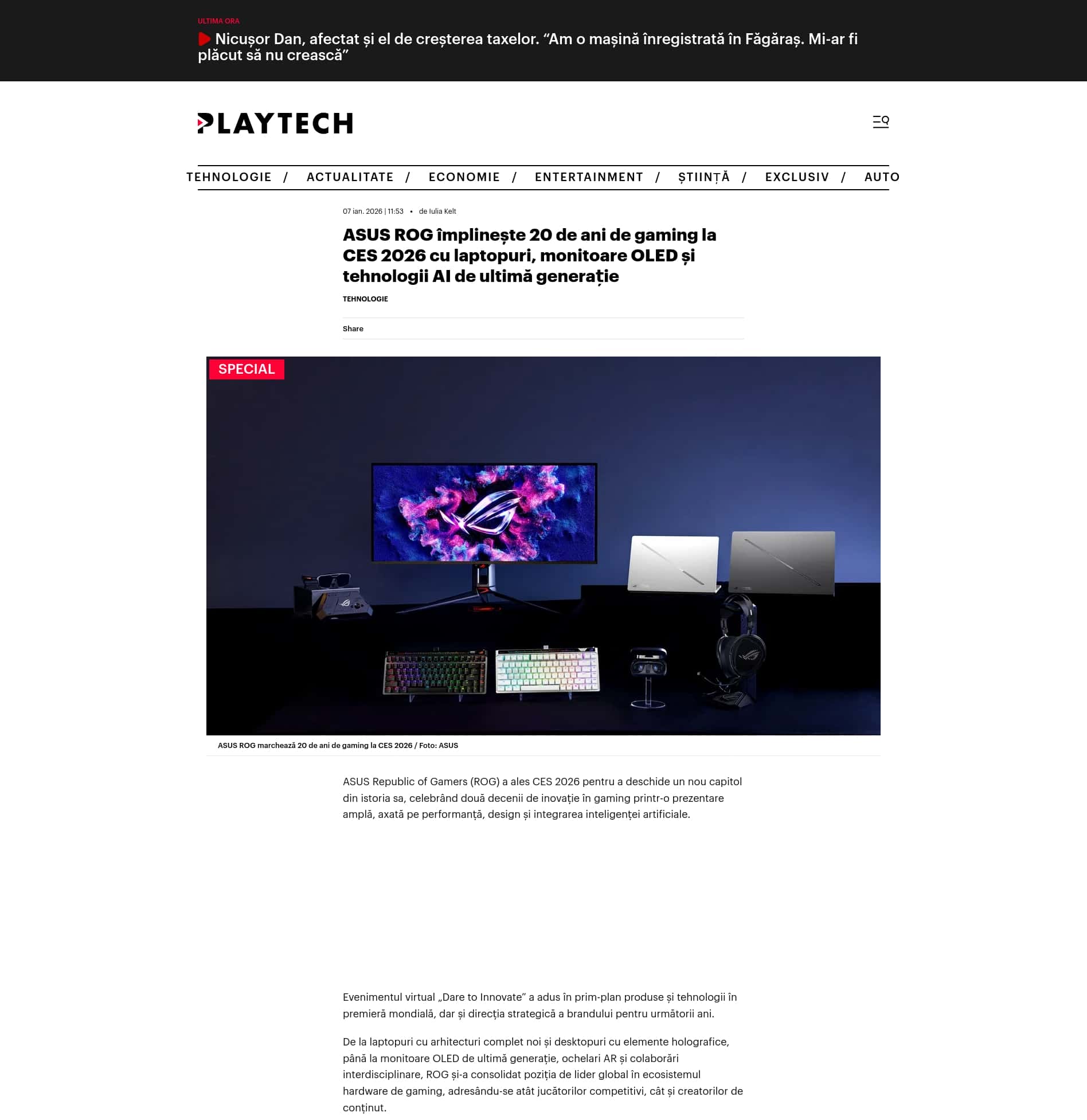 ASUS ROG împlinește 20 de ani de gaming la CES 2026 cu laptopuri, monitoare OLED și tehnologii AI de ultimă generație