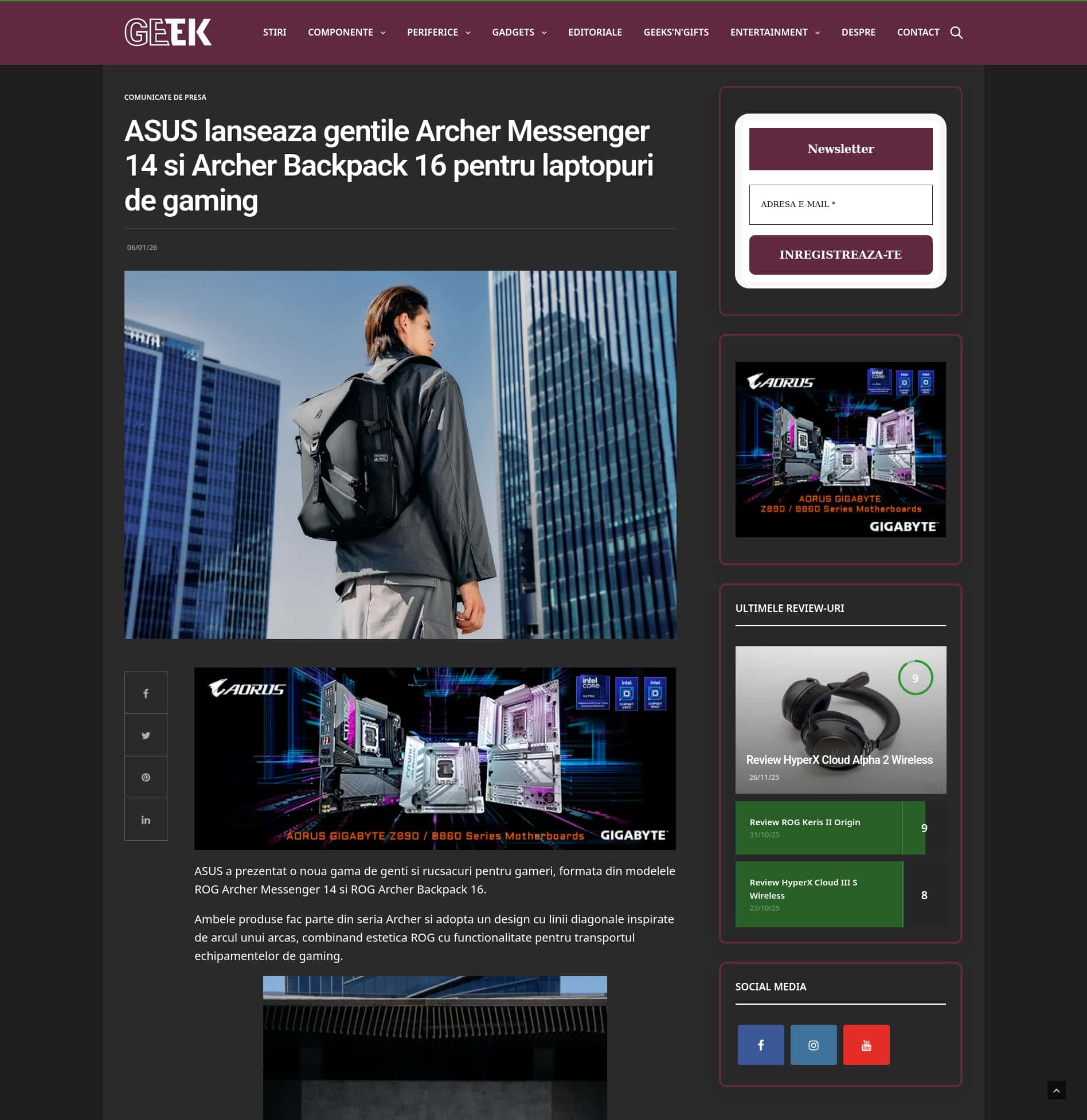 ASUS lanseaza gentile Archer Messenger 14 si Archer Backpack 16 pentru laptopuri de gaming