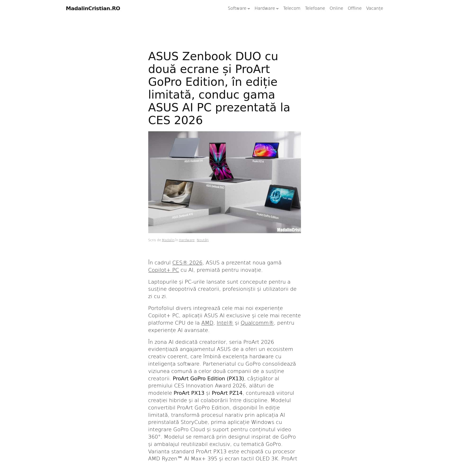 ASUS Zenbook DUO cu două ecrane și ProArt GoPro Edition, în ediție limitată, conduc gama ASUS AI PC prezentată la CES 2026