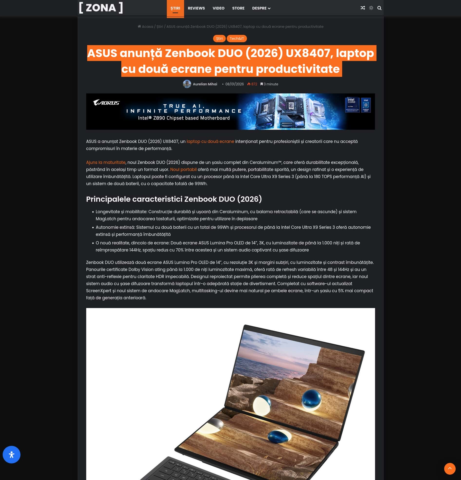 ASUS anunță Zenbook DUO (2026) UX8407, laptop cu două ecrane pentru productivitate