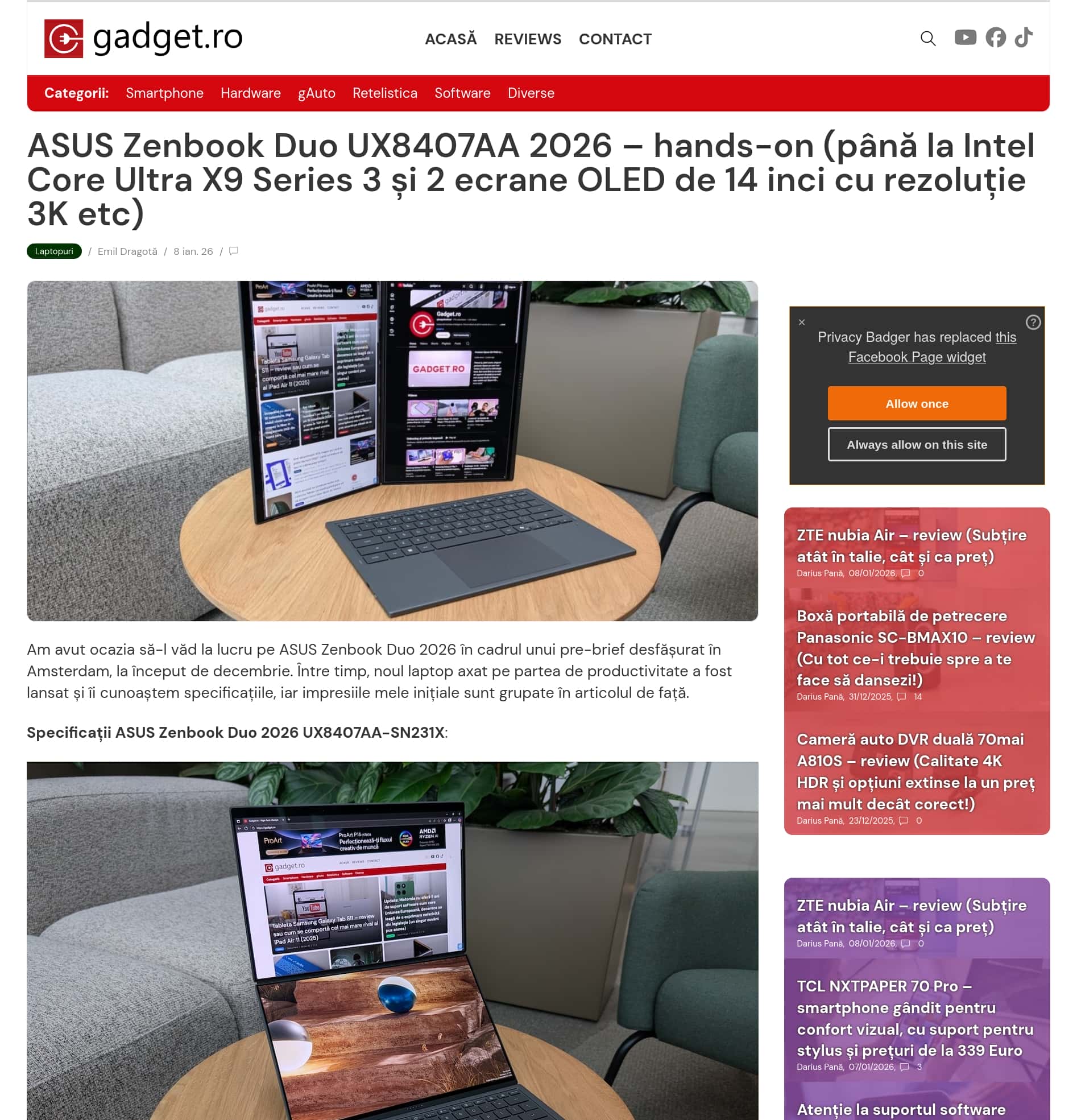 ASUS Zenbook Duo UX8407AA 2026 – hands-on (până la Intel Core Ultra X9 Series 3 și 2 ecrane OLED de 14 inci cu rezoluție 3K etc)