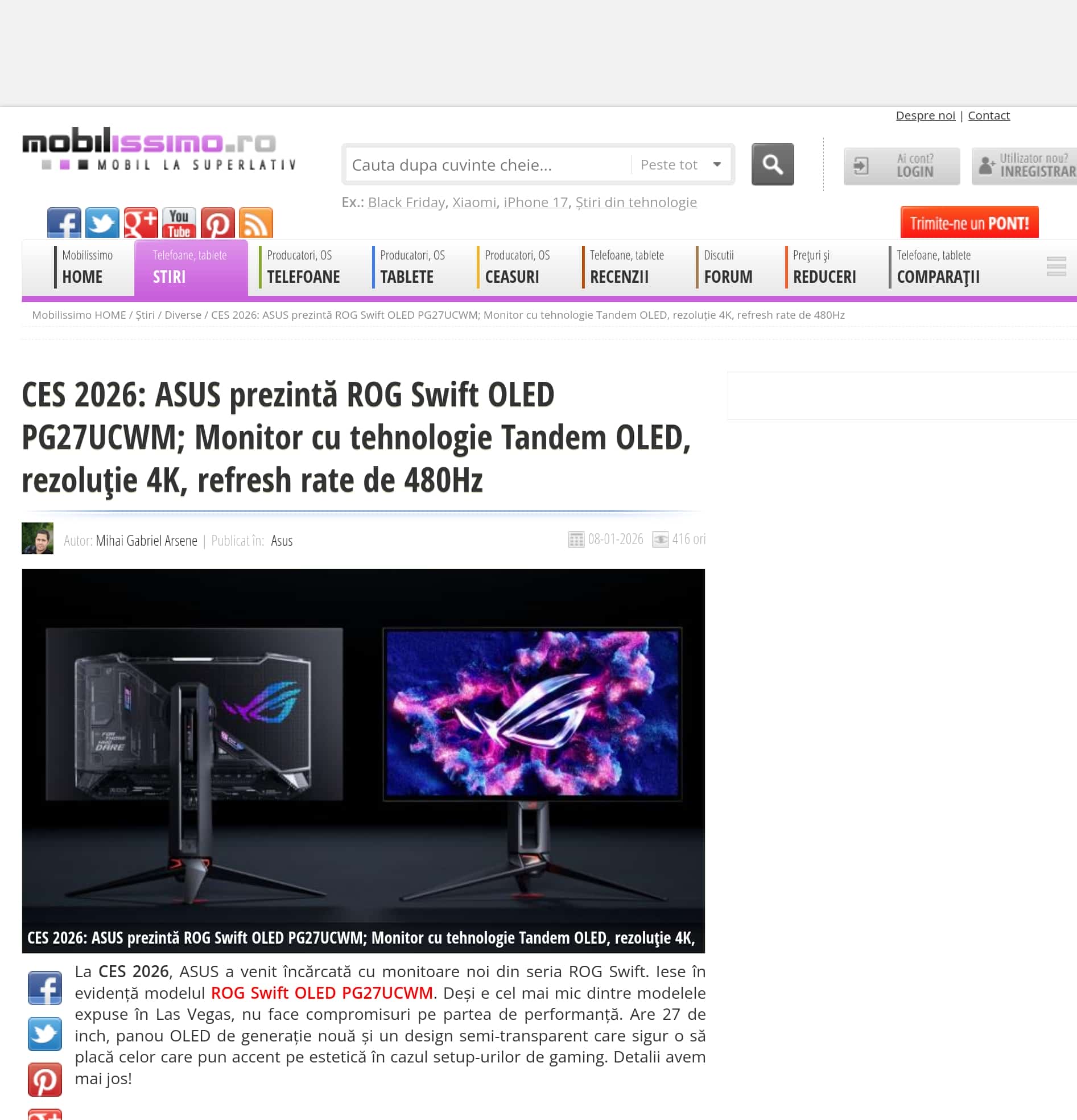 CES 2026: ASUS prezinta ROG Swift OLED PG27UCWM; Monitor cu tehnologie Tandem OLED, rezoluție 4K, refresh rate de 480Hz