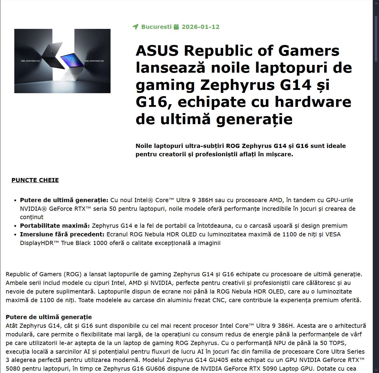 ASUS Republic of Gamers lanseaza noile laptopuri de gaming Zephyrus G14 și G16, echipate cu hardware de ultima generație