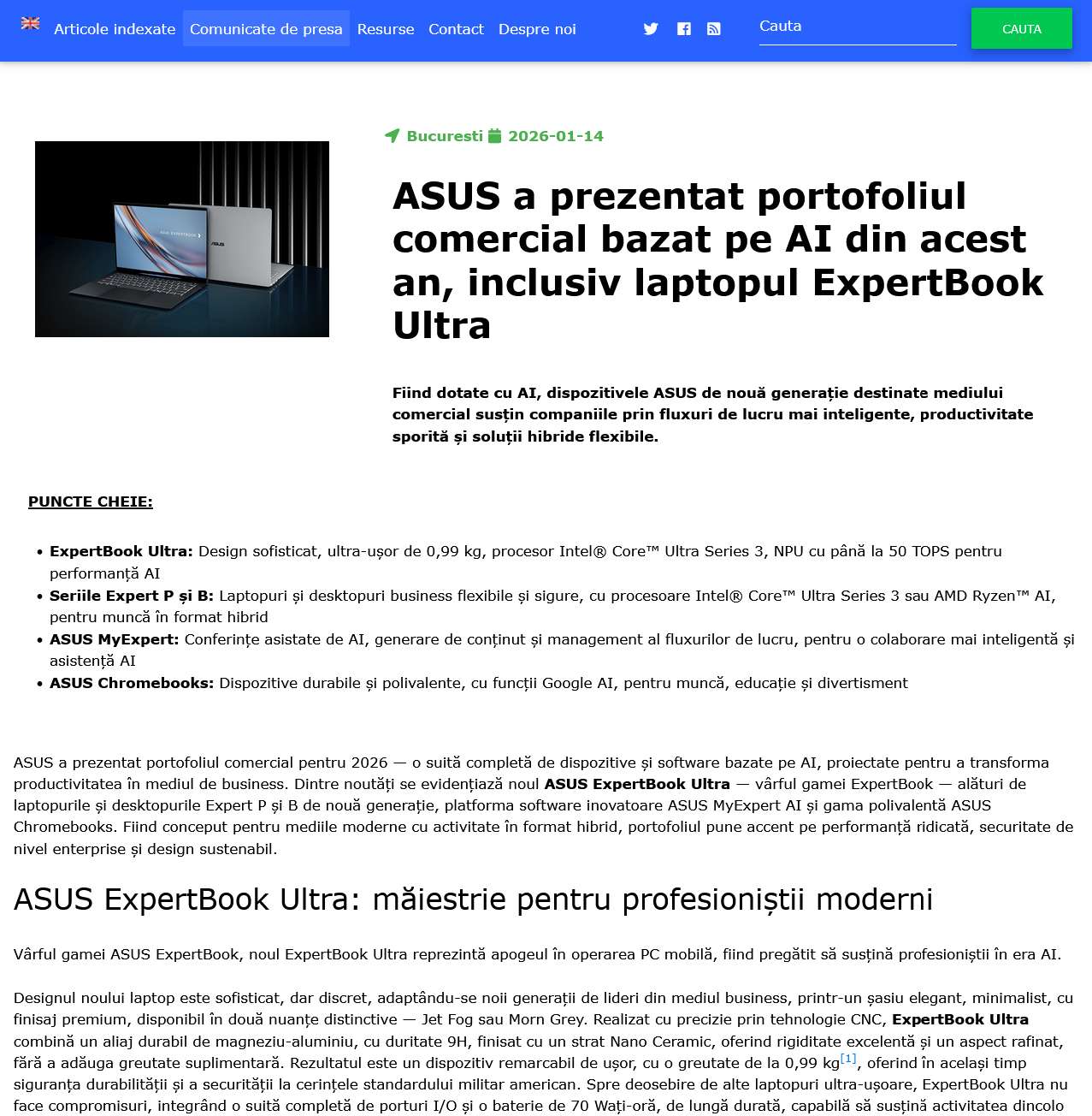 ASUS a prezentat portofoliul comercial bazat pe AI din acest an, inclusiv laptopul ExpertBook Ultra
