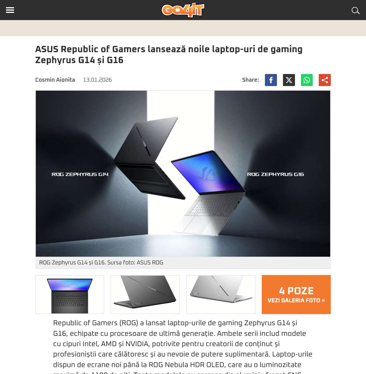 ASUS Republic of Gamers lansează noile laptop-uri de gaming Zephyrus G14 și G16