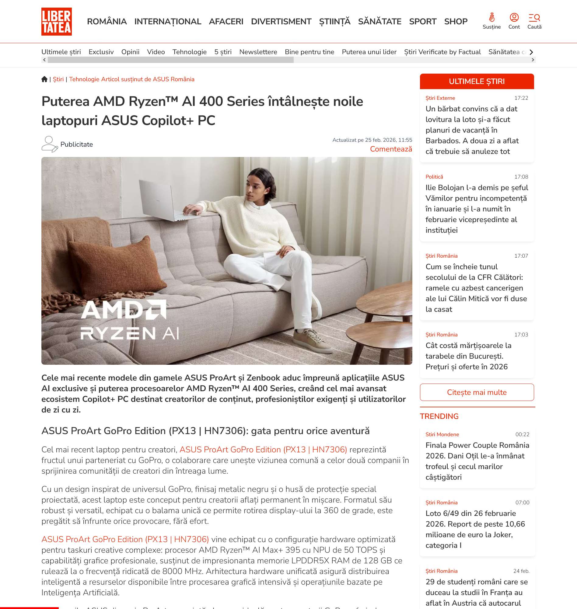 Puterea AMD Ryzen™ AI 400 Series întâlnește noile laptopuri ASUS Copilot+ PC Citeşte întreaga ştire: Puterea AMD Ryzen™ AI 400 Series întâlnește noile laptopuri ASUS Copilot+ PC