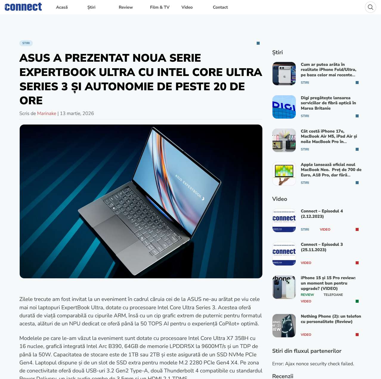 ASUS a prezentat noua serie ExpertBook Ultra cu Intel Core Ultra Series 3 și autonomie de peste 20 de ore