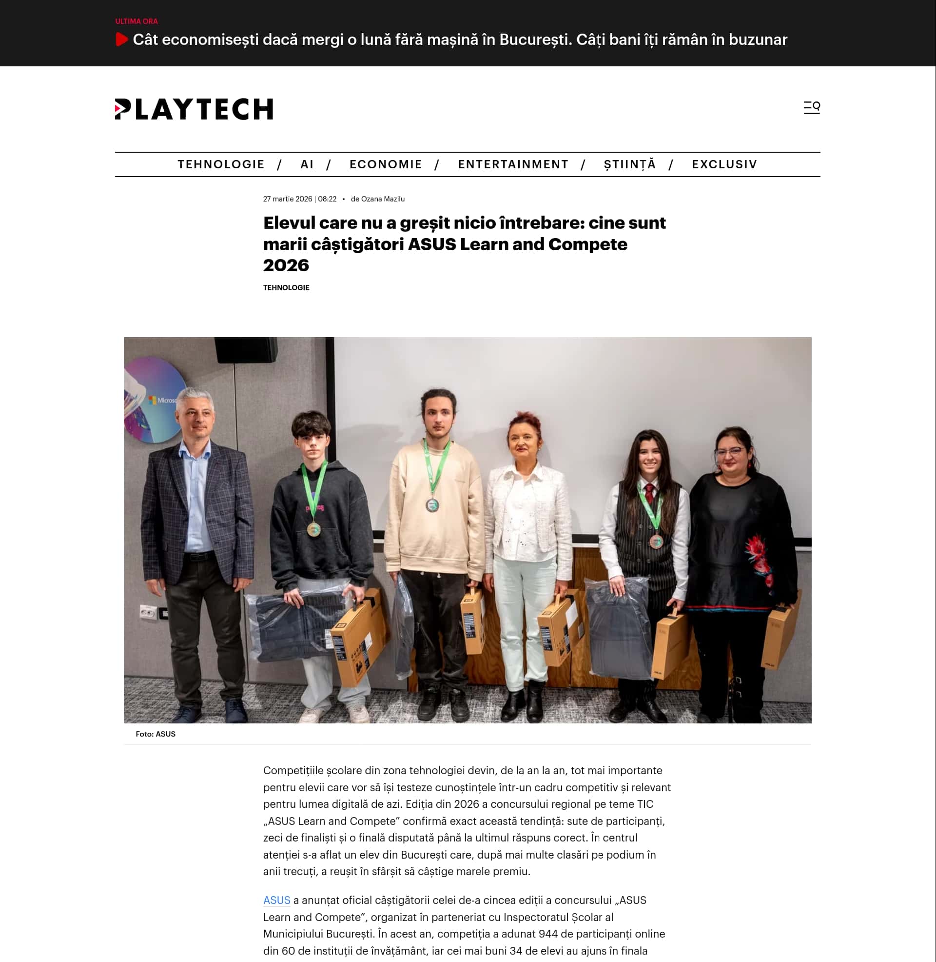 ASUS concluded the fifth edition of the regional “ASUS Learn and Compete” ICT contest. The top three students and their teachers were awarded ASUS ExpertBook laptops, and the competition was organized in partnership with the Bucharest School Inspectorate.