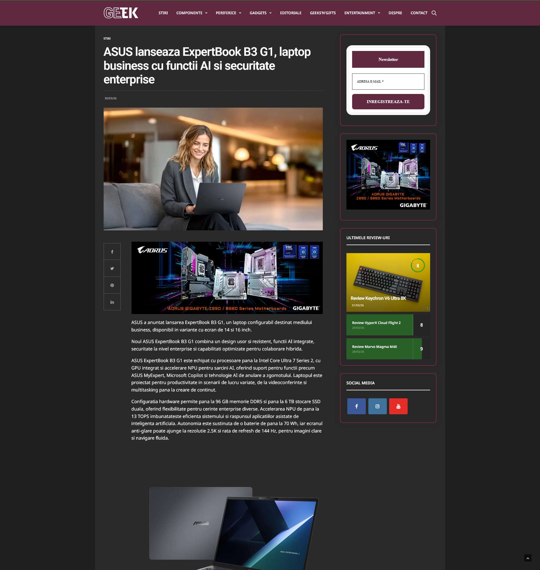 ASUS lanseaza ExpertBook B3 G1, laptop business cu functii AI si securitate enterprise