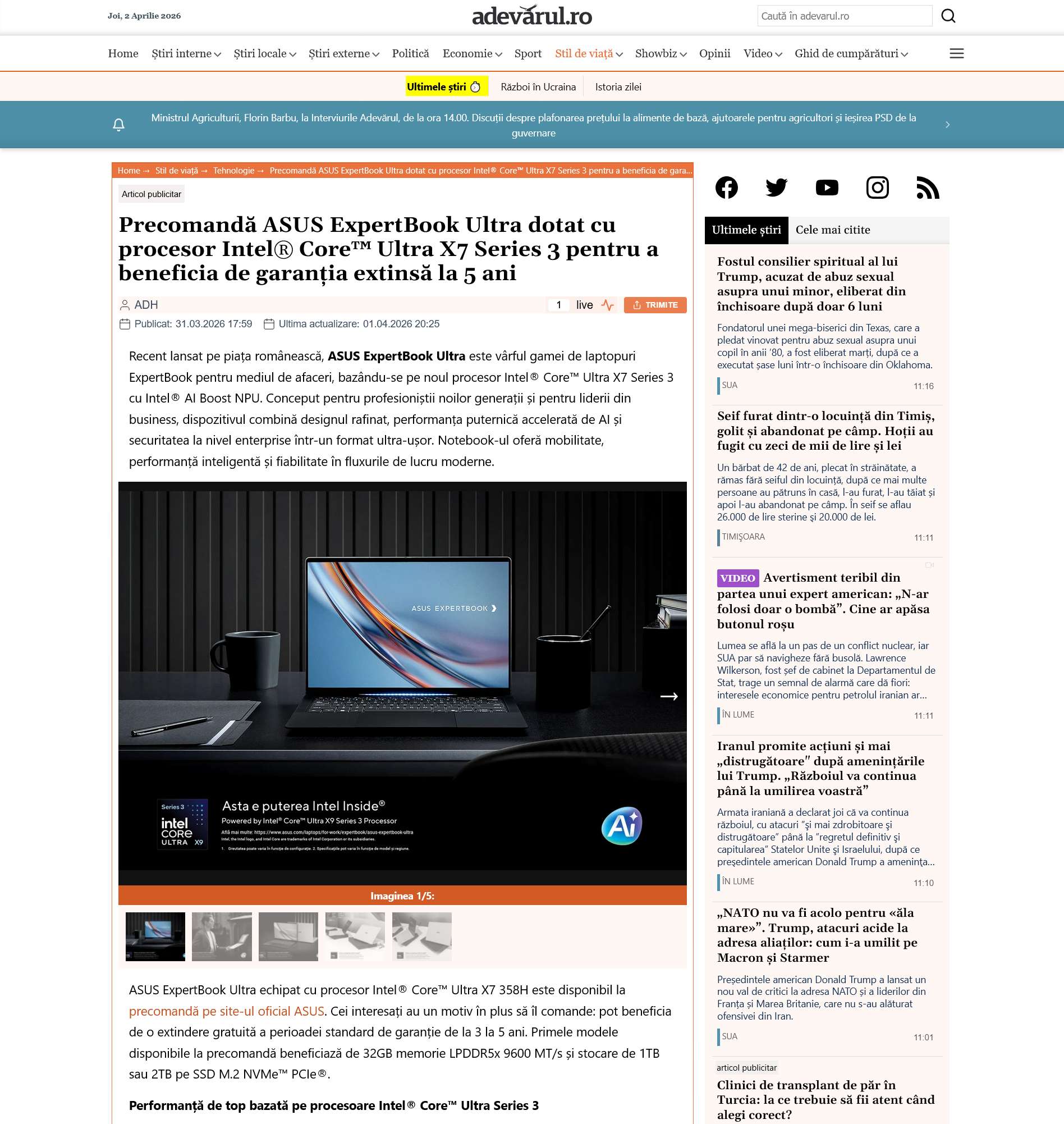 Precomanda ASUS ExpertBook Ultra dotat cu procesor Intel® Core™ Ultra X7 Series 3 pentru a beneficia de garanția extinsa la 5 ani