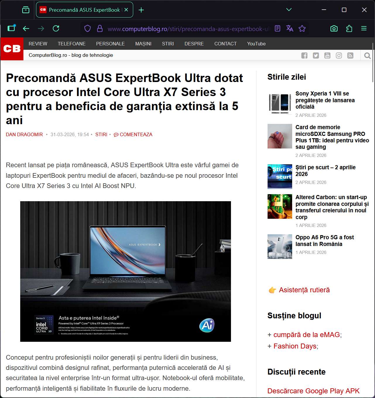 Precomandă ASUS ExpertBook Ultra dotat cu procesor Intel Core Ultra X7 Series 3 pentru a beneficia de garanția extinsă la 5 ani