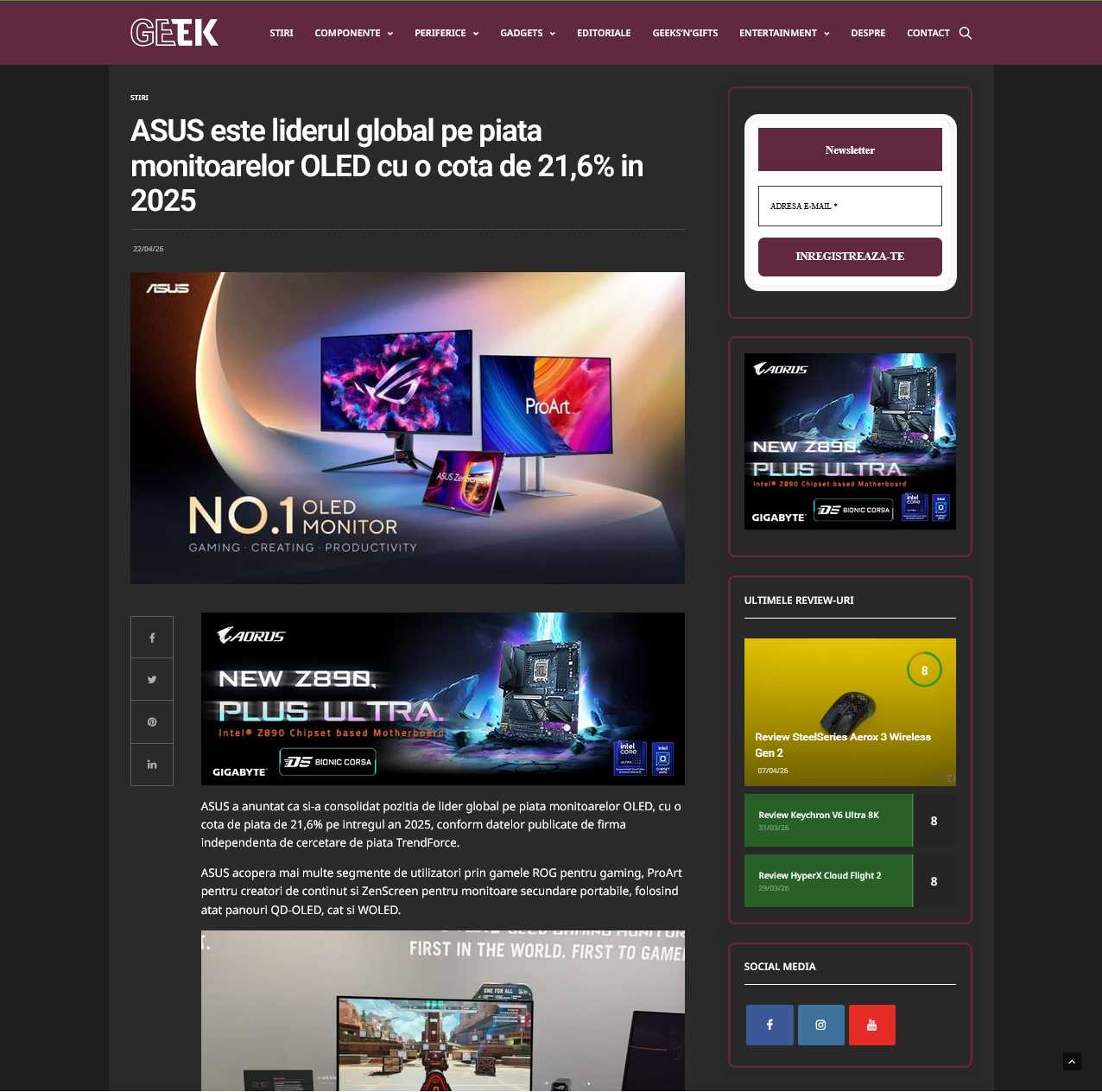ASUS este liderul global pe piata monitoarelor OLED cu o cota de 21,6% in 2025